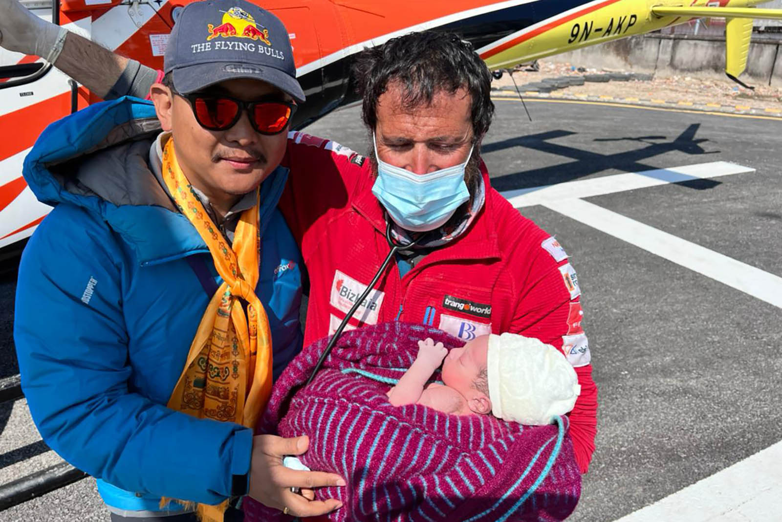 That’s not unheard of among climbers. Two years ago, Spanish climber Alex Txikon was on his way back from Manaslu by helicopter. En route, they picked up a pregnant woman in labor during a refueling stop at Samagaun. She gave birth to her baby in the helicopter.