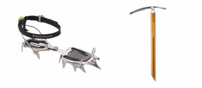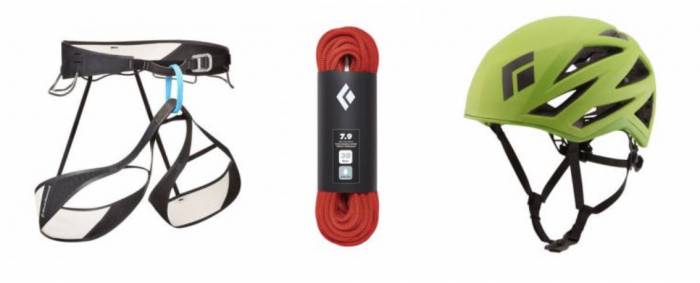 Black Diamond Vision Harness ($150), 7.9 Dry Climbing Rope ($200), Vapor Helmet ($140), Snaggletooth Crampons ($220), and Raven Ultra Ice Axe ($120)