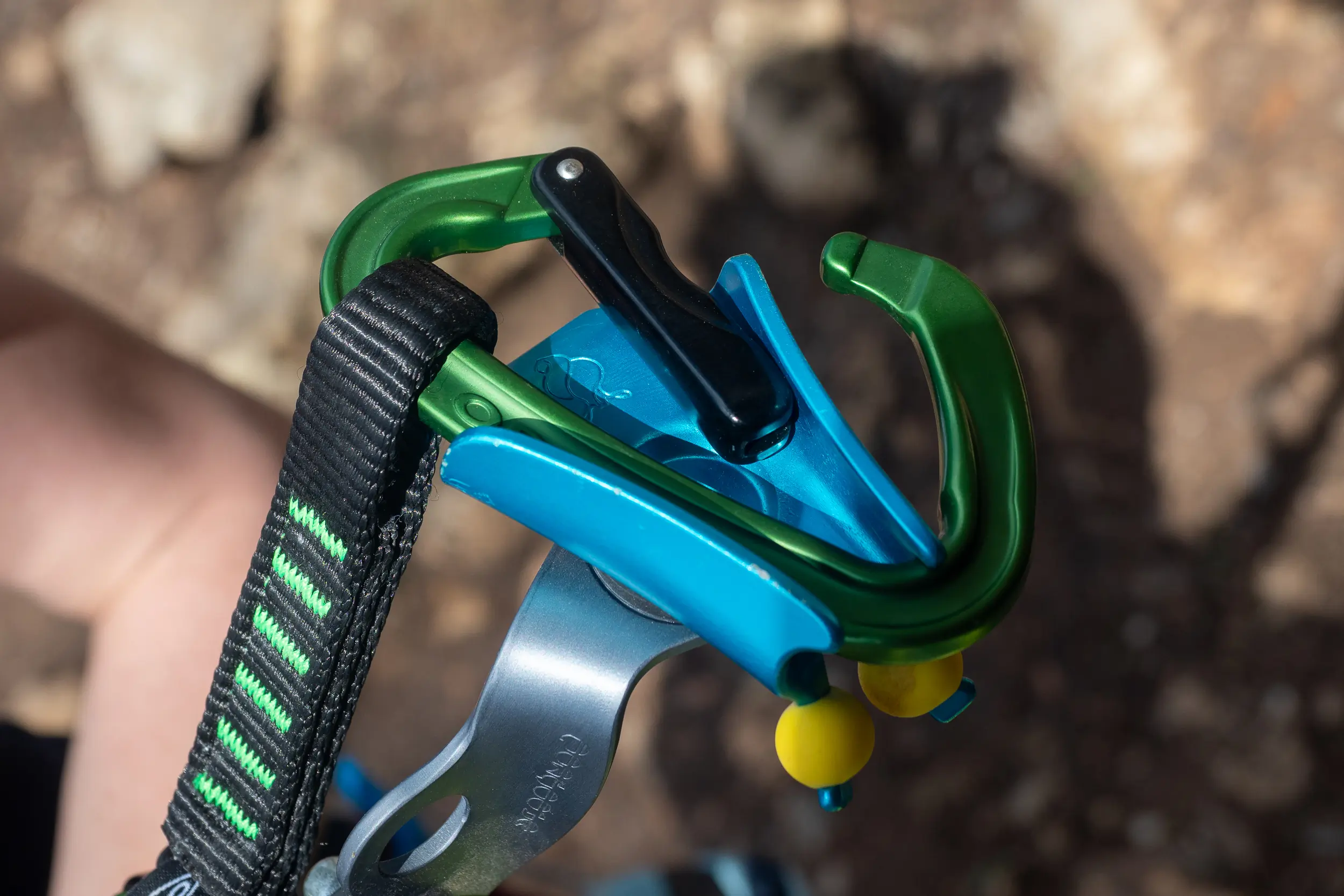 The horizontally aligned loop of rope made it much easier and more consistent to open the top carabiner’s gate fully. And the silicone beads held quickdraw steady so I could consistently get it out of the hanger and lower it to myself on the first try.