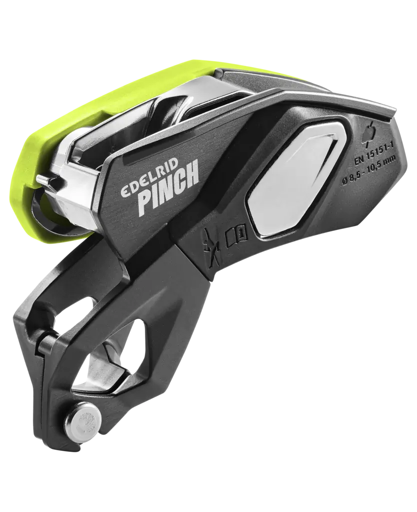 Edelrid specifies ropes between 8.5mm and 10.5mm work with the Pinch, and it’s EN dual certified. The Edelrid Pinch weighs a verified 8.3 ounces. It measures 4 3/8″ x 2 3/4″ x 1 3/8″, and the MSRP is $120.