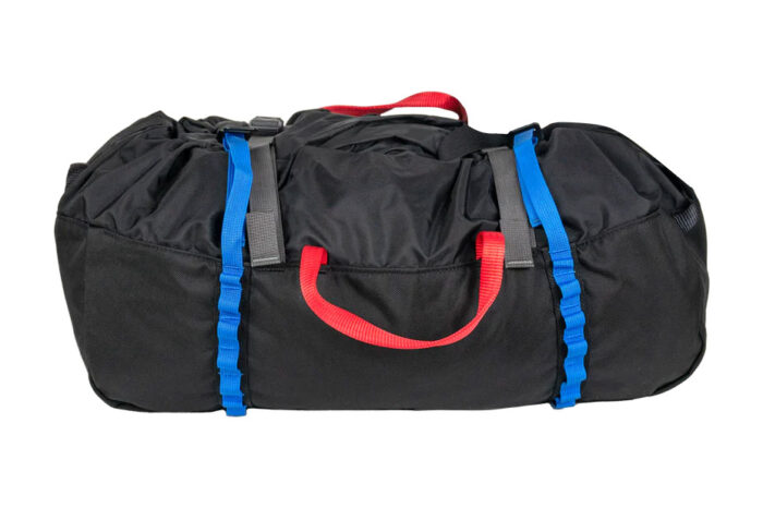 The rope bag has the standard features of the best rope bags: rope tie-off points, a spacious tarp, and four corner haul handles for moving the tarp without repacking the rope.