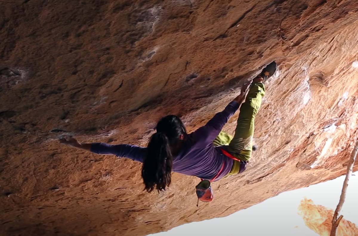 Yet the area’s routes remain the gold standard for bouldering grades, and it’s no small thing to send a V12 in this rocky desert paradise. In this send, Puccio battles her way through the power endurance testpiece that is “Shaken, Not Stirred.” This 35-foot problem is mostly roof hanging right above the ground (which is partly why visibility is so bad for the first 30 seconds or so).