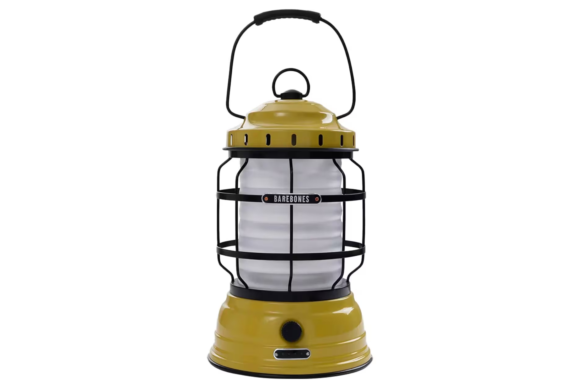 This LED lantern with traditional looks uses two rechargeable batteries for fuel. It’s made with a stainless steel frame and has a carry handle and knob for adjusting brightness.