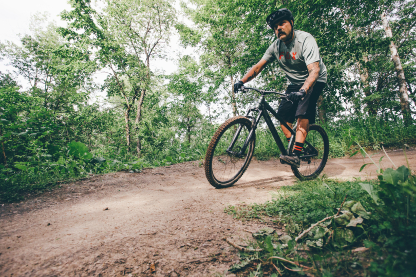 The Double Peak 3 has an SR Suntour 120mm coil spring suspension fork and runs a Shimano CUES 1×9-speed drivetrain. Lastly, the bike has hydraulic Shimano disc brakes with 180mm and 160mm rotors for stopping power and precision braking during downhills.