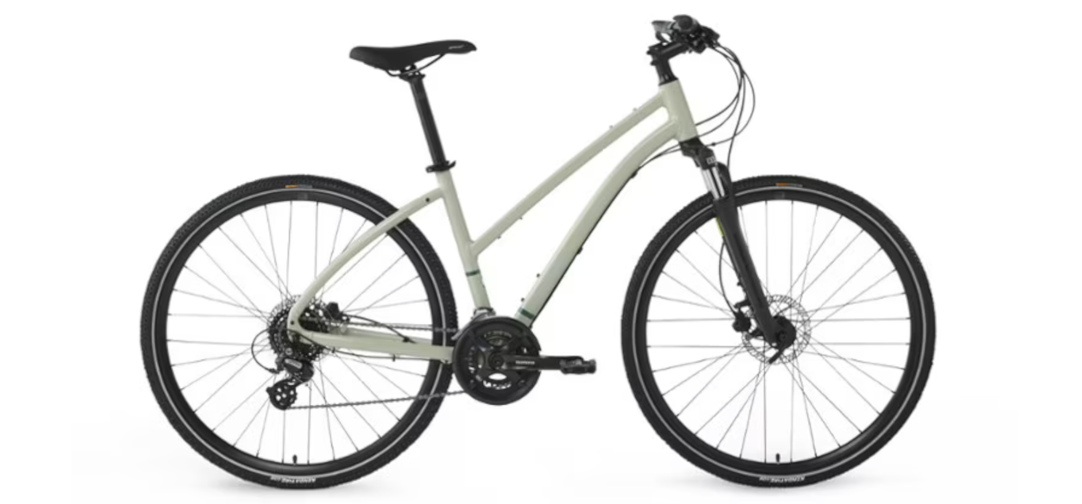 The brand says it’s a 16-speed with a 2×9 drivetrain on a Shimano 46/30T crankset and runs a Shimano Altus group. It has an aluminum frame with 700c wheels, disc brakes, and a suspension fork with 63 mm of travel.