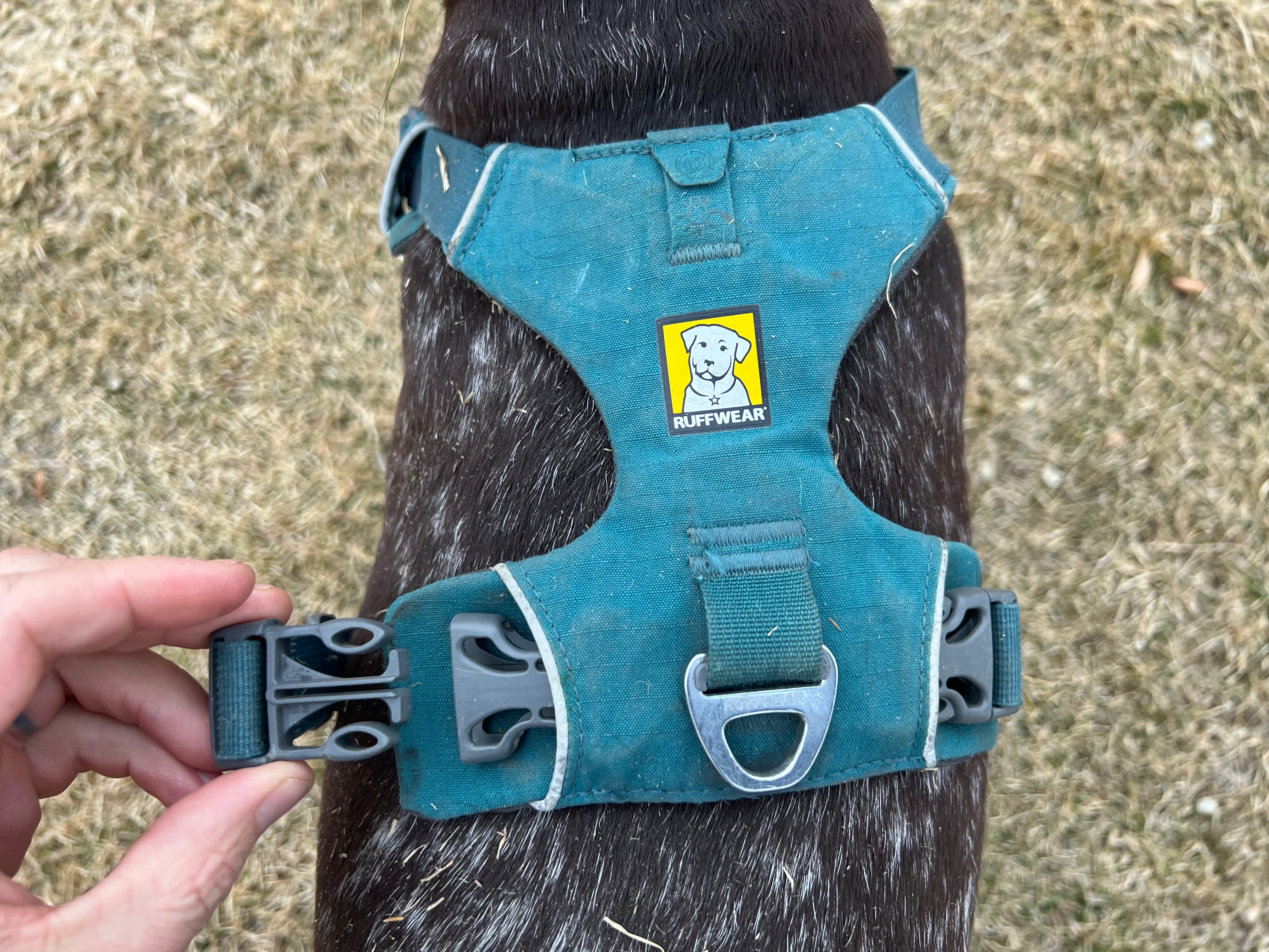 So to say we’ve tested the Front Range Dog Harness is an understatement. We literally destroyed one, finally wearing the metal attachment ring through the very tough fabric of the harness until it broke after about 3 years of use.