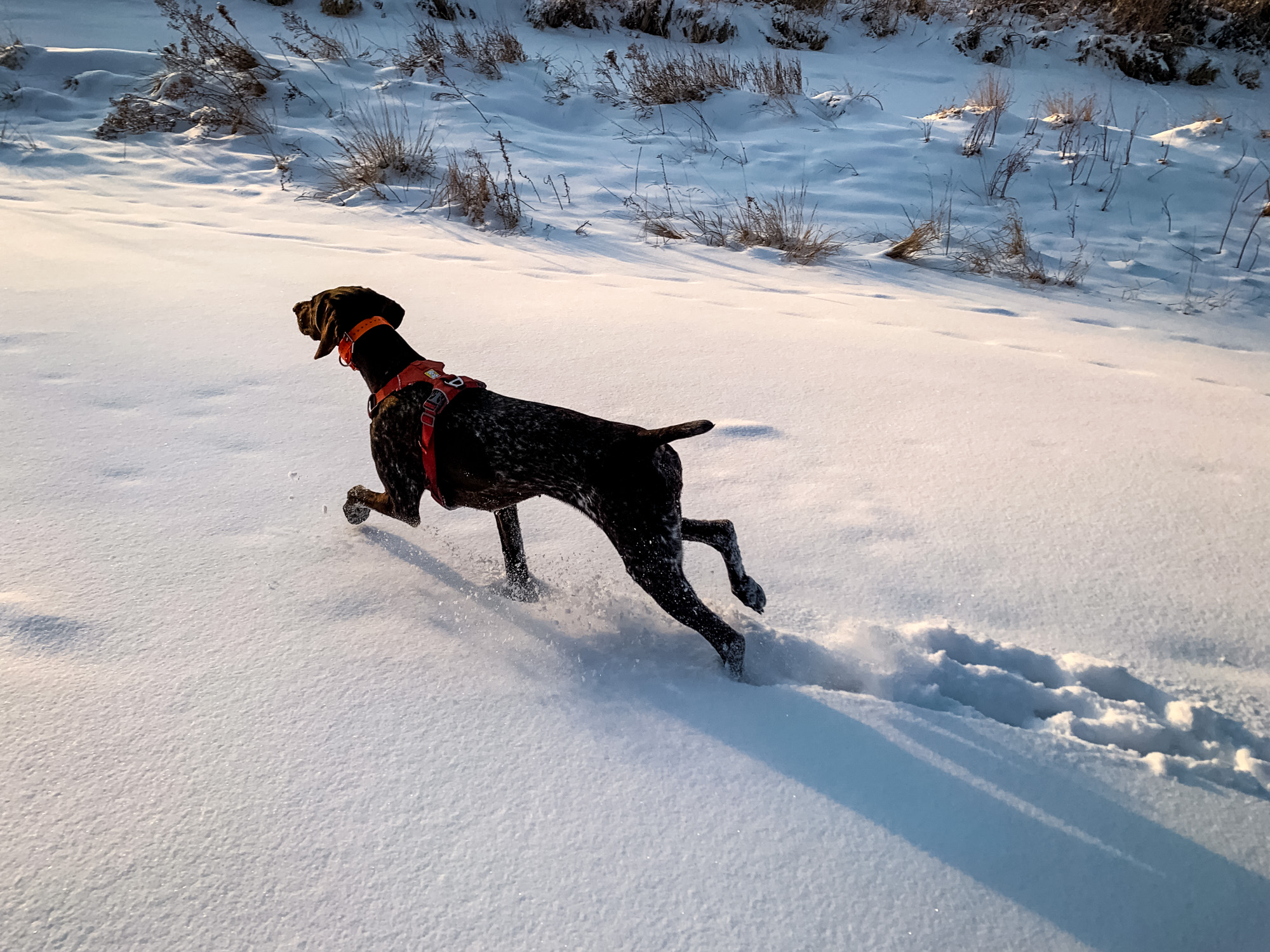 For those who own GSPs and know about the half-hitch-around-the-belly method, well, the harness accomplishes a similar goal, but without eliciting weird stares from non-sporting dog people. It doesn’t work quite as well, but it’s close enough.