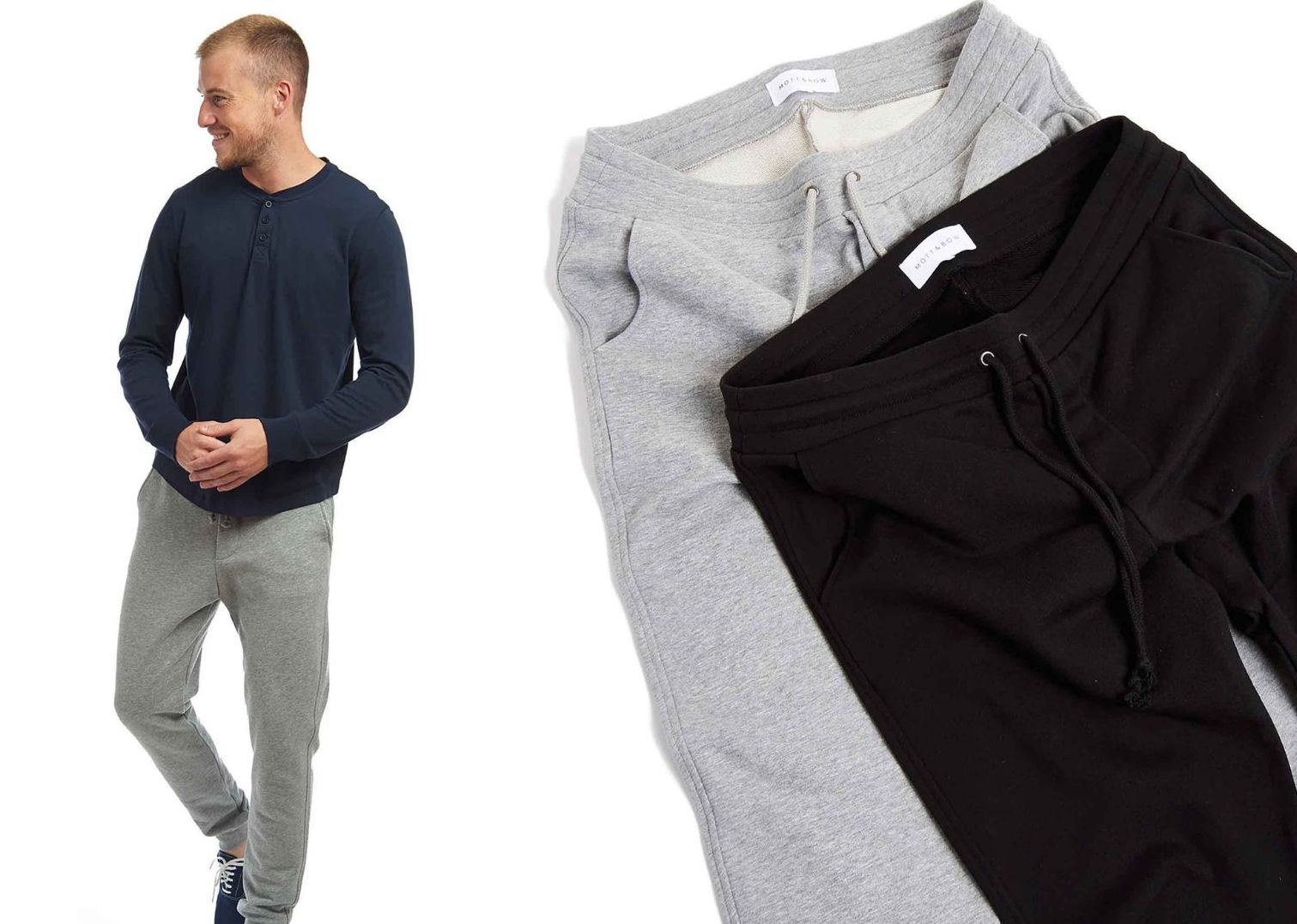 Clothing brand Mott & Bow believes sweatpants get a bad rep for being “too casual.” Its Hooper pants ($99) ride a hybrid line with a trimmer cut and tapered legs for a less-baggy look and feel.