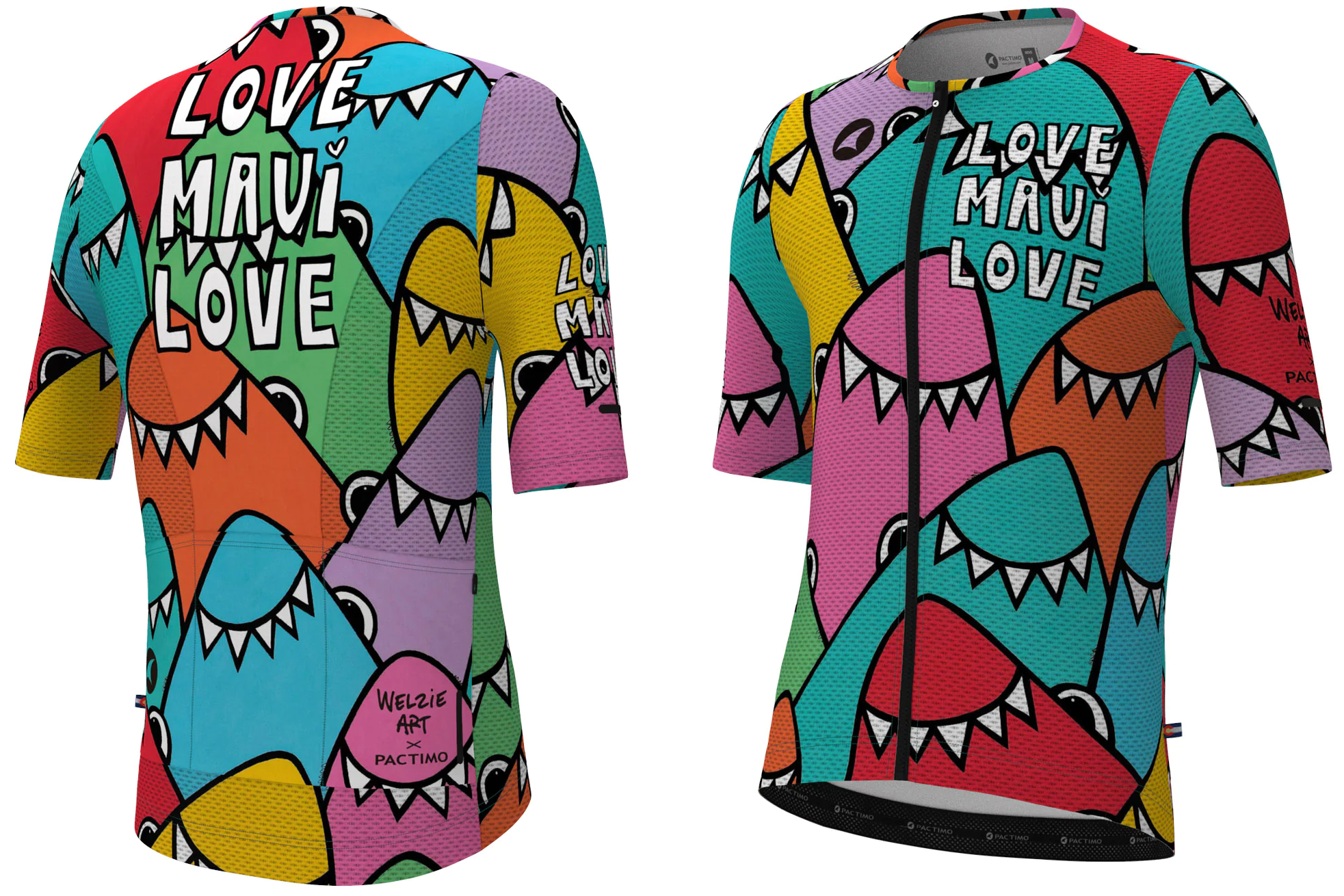 Another way is to purchase a made-to-order 37.5 Summit Aero Mesh bike jersey, a collaboration between Pactimo and local Maui artist Welzie. These special-edition jerseys sport a special “Love Maui Love” message, retail for $125, and — with $60 from every sale going to relief efforts — benefit both the Maui Strong Fund and two local bike shops destroyed in the fire: Maui Sunriders Bike Shop and West Maui Cycles.