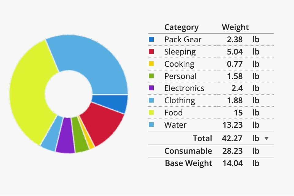 Not only does he have every single piece of gear listed, including its weight, but he also has a pie chart totaling everything up and dividing weight by categories. He also had a separate “food calories” Google spreadsheet listing every food item he brought, including info on flavor, weight, number of calories, fat, carbs, fiber, sugar, and so on.