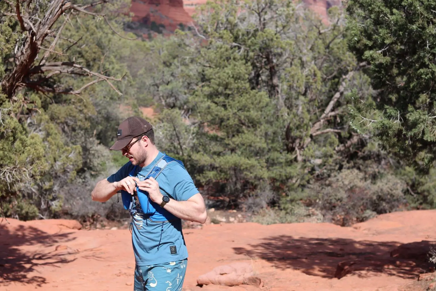 Make sure to organize all your gear so the weight is evenly balanced and there isn’t too much in the front or the back. Also, make sure you can access the gear you need quickly, ideally without having to take your hydration pack or vest off.