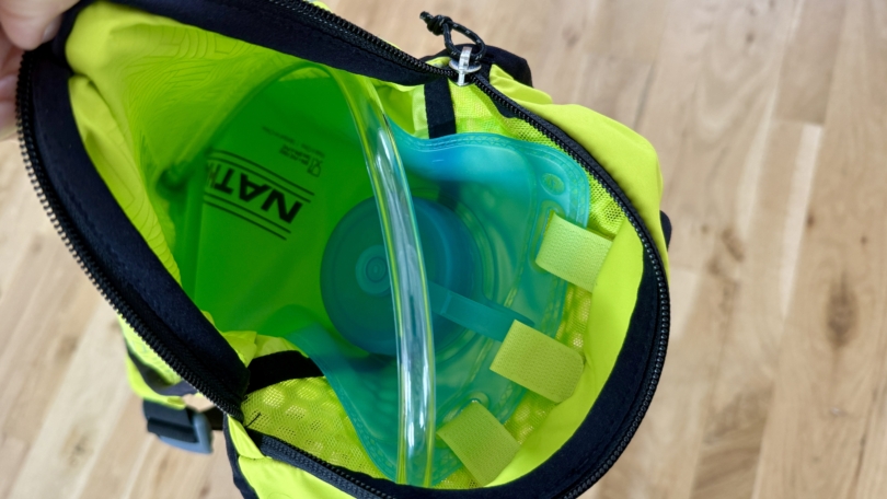 Most running vests and hydration packs have space for a hydration reservoir in the back. This looks like a sleeve to slip a reservoir into. The best options have a way to hold up the reservoir so that while you’re drinking from it, it doesn’t slip down in the sleeve.