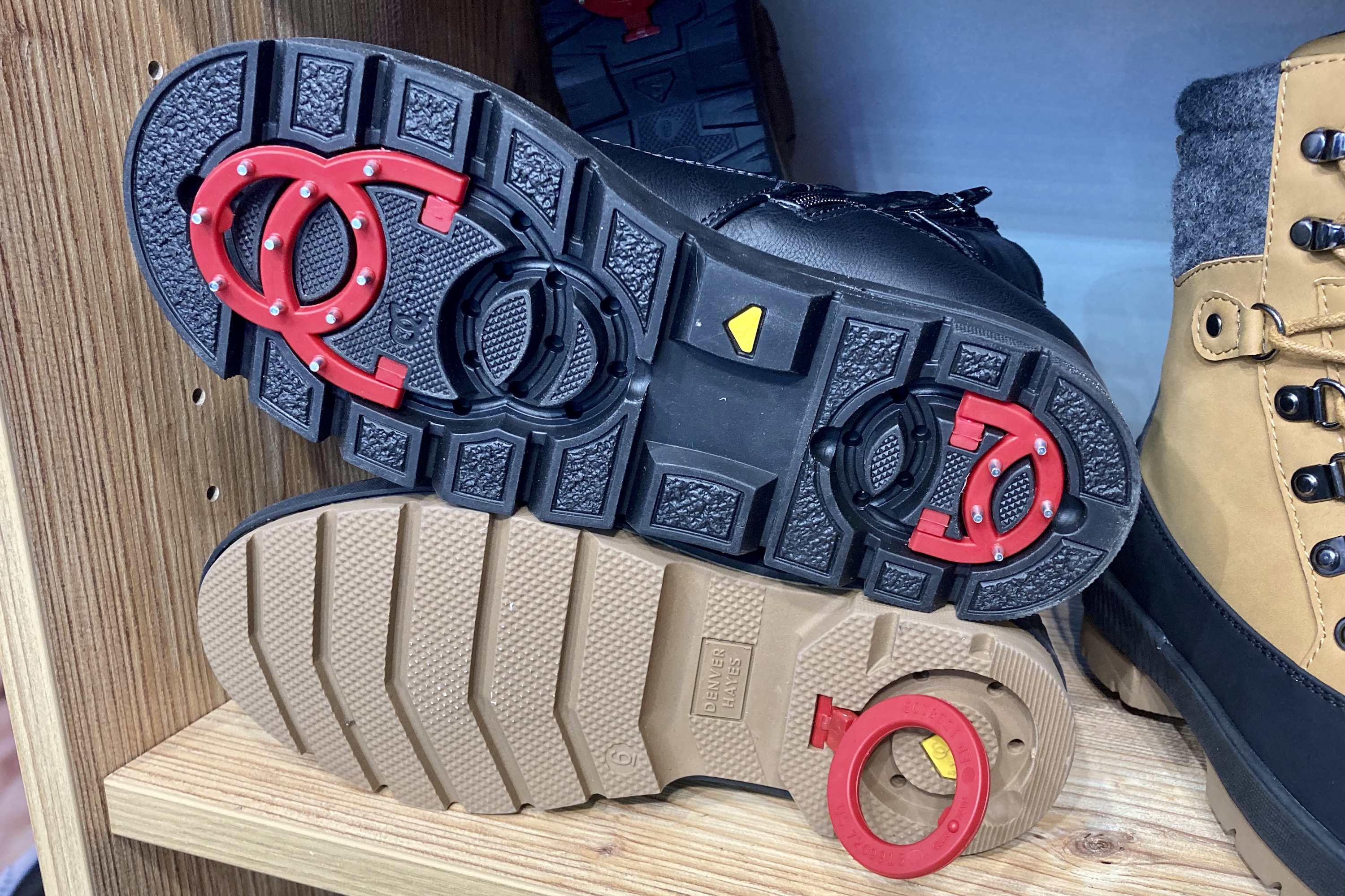 But the Alpi OC system (named for the shape of the system in the sole) cleverly allows the user to tuck the studs away with a quick adjustment. When going from an icy sidewalk to, say, a concrete street sans ice, the user just needs to release the OC inserts and hinge them into a recessed part of the sole. The moving parts and components are completely replaceable, but makers say they are also very durable, so replacement needs are rare.