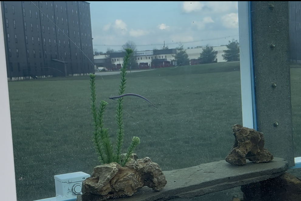 After seeing the new slime layer, we headed outside to see the baits underwater in a tank. The minnow is impressive. Thanks to an air chamber in the middle of it, it rolls and kicks exactly how you’d want it to. It’ll be perfect for scoping.