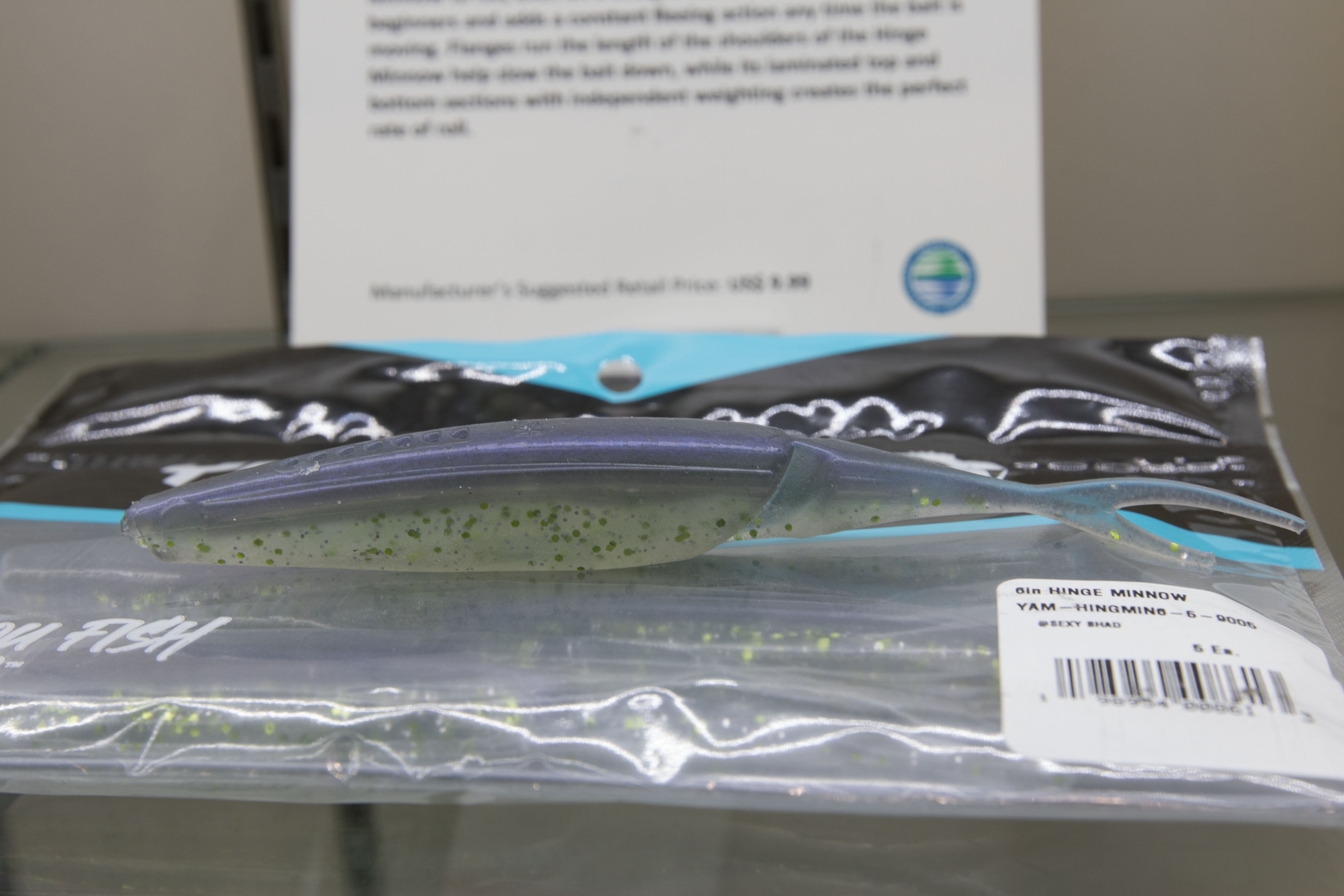 While strolling through the new product section, the Hinge Minnow’s hinged body immediately drew me in. It looked like a fluke, with an articulated section. I watched this bait work underwater, and it rolls an impressive amount. It makes other fluke baits look like junk.