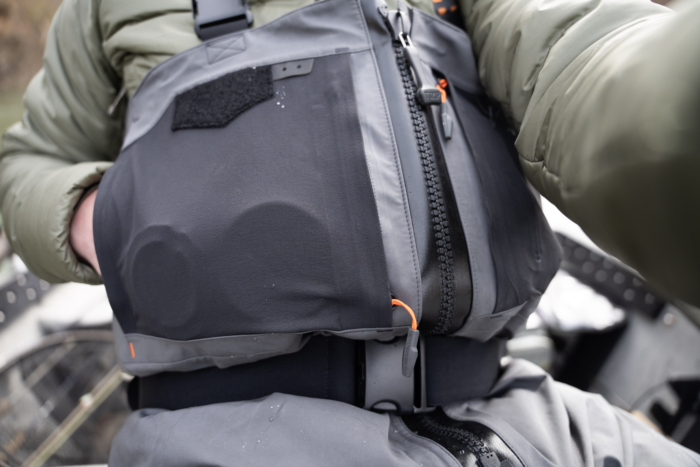 That’s already an impressive amount of storage, but it doesn’t stop there. On the rear of the wader, there’s a giant kangaroo-style pocket, accessible from zippered ports on each side. It’s there to hold a water bottle (or your favorite cervaza) or additional fly boxes.