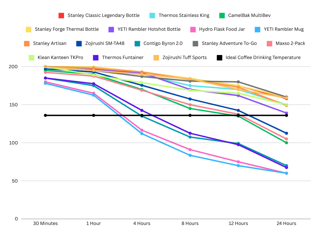 Each thermos simultaneously receives a full serving of 200-degree F water, and is then surveyed for temperature at 30 minutes, 1 hour, 4 hours, 8 hours, 12 hours, and 24 hours. While we understand that some folks recommended preheating their thermoses for maximum efficiency, we wanted to replicate the most likely scenario and poured our brew into room-temp vessels.