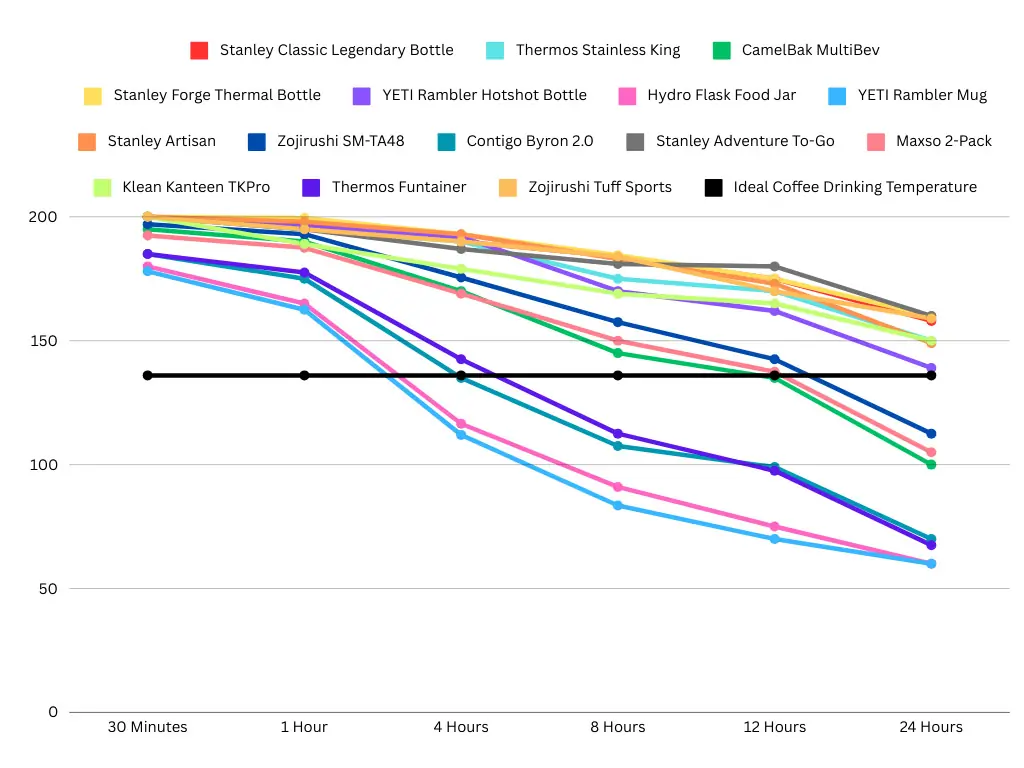 | Thermos Stainless King | 200 F | 195 F | 190 F | 175 F | 170 F | 150 F |