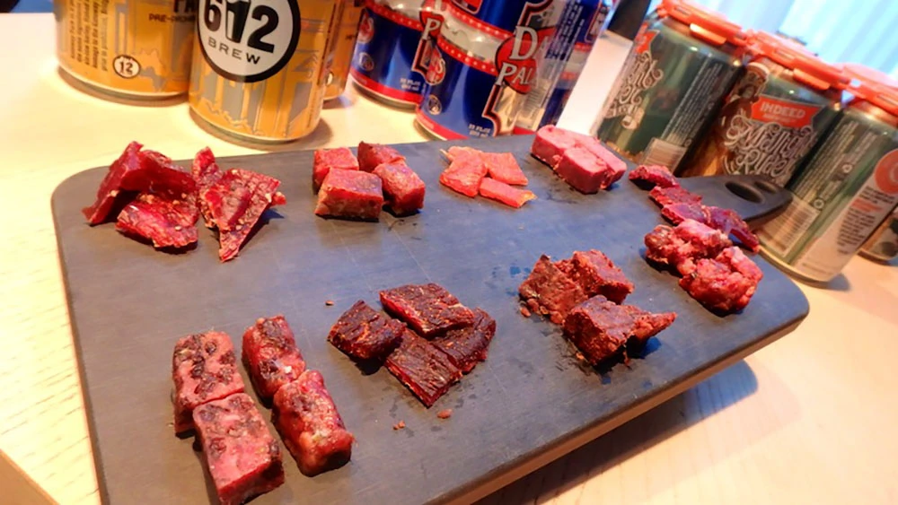 We decided to put a few Epic Bars to the test against jerky. Each of our testers tried a piece of various bars and a couple different beef jerky types in a blind taste test and “cleansed our palates” with beer in between each taste. We gathered some impressions of the products, listed below.