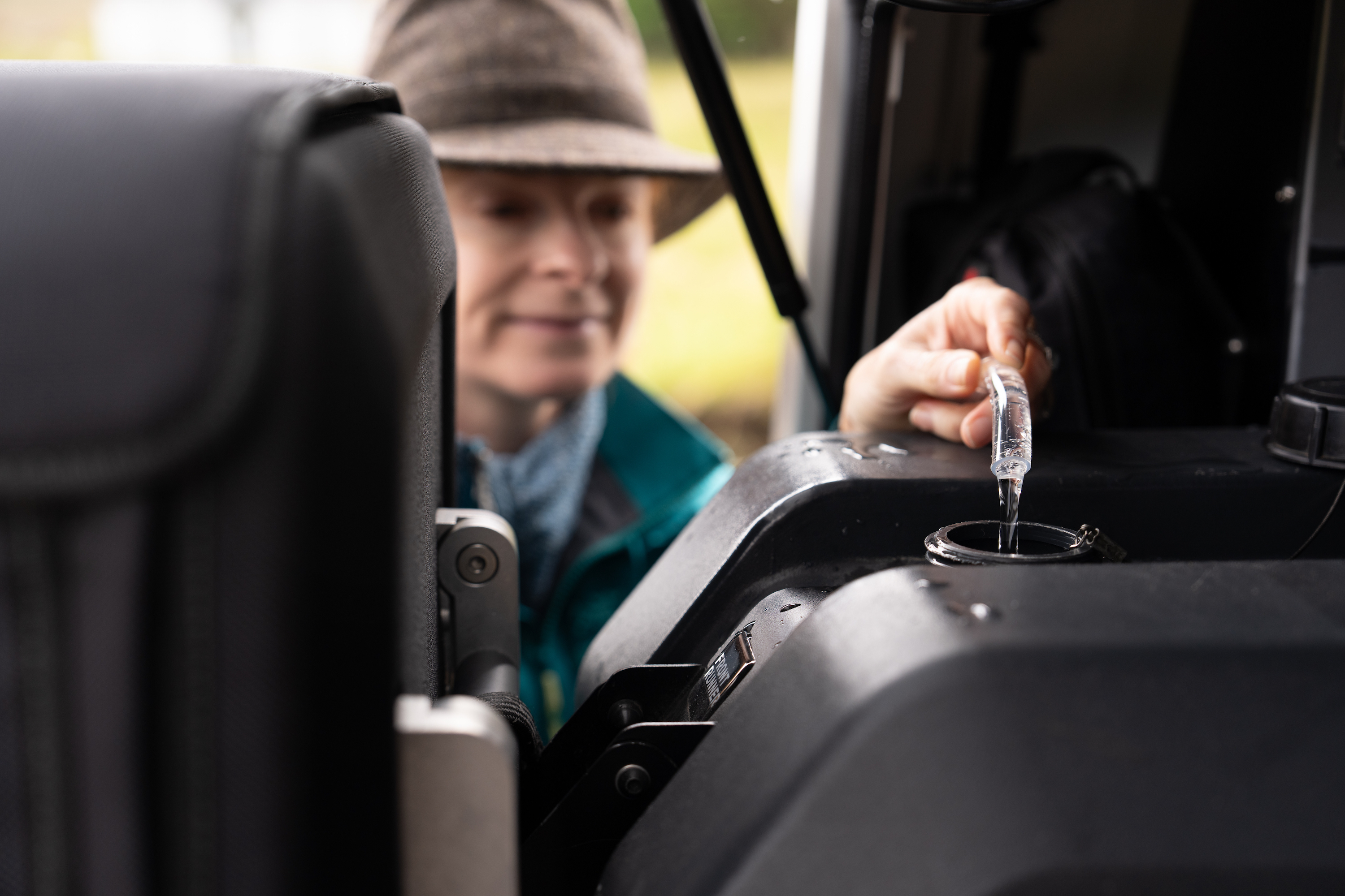 - Replenishes your rig’s built-in tank without needing to park at the water’s edge