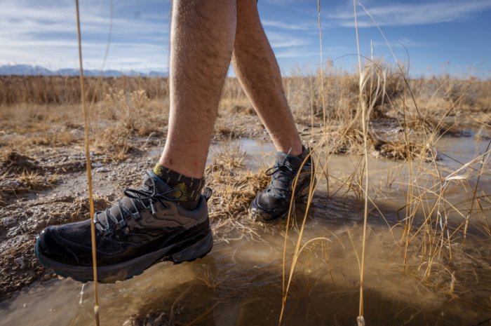 We hiked the Speedgoats up steep passes in the Eastern Sierra, where we encountered steep rock steps, often flowing with spring runoff. The Vibram outsoles gripped well on wet rock slabs, and the lugs handled the soft sand and gravel found on lower-elevation trails in the high desert. Even without gaiters, small pebbles and debris never got in around the snug ankle cuff.