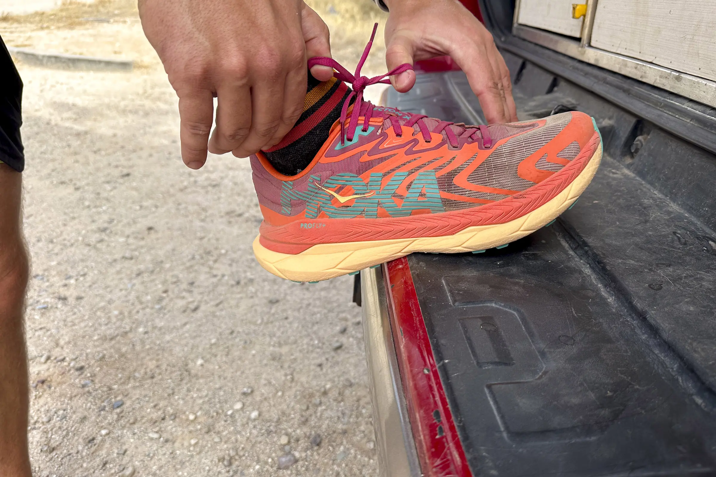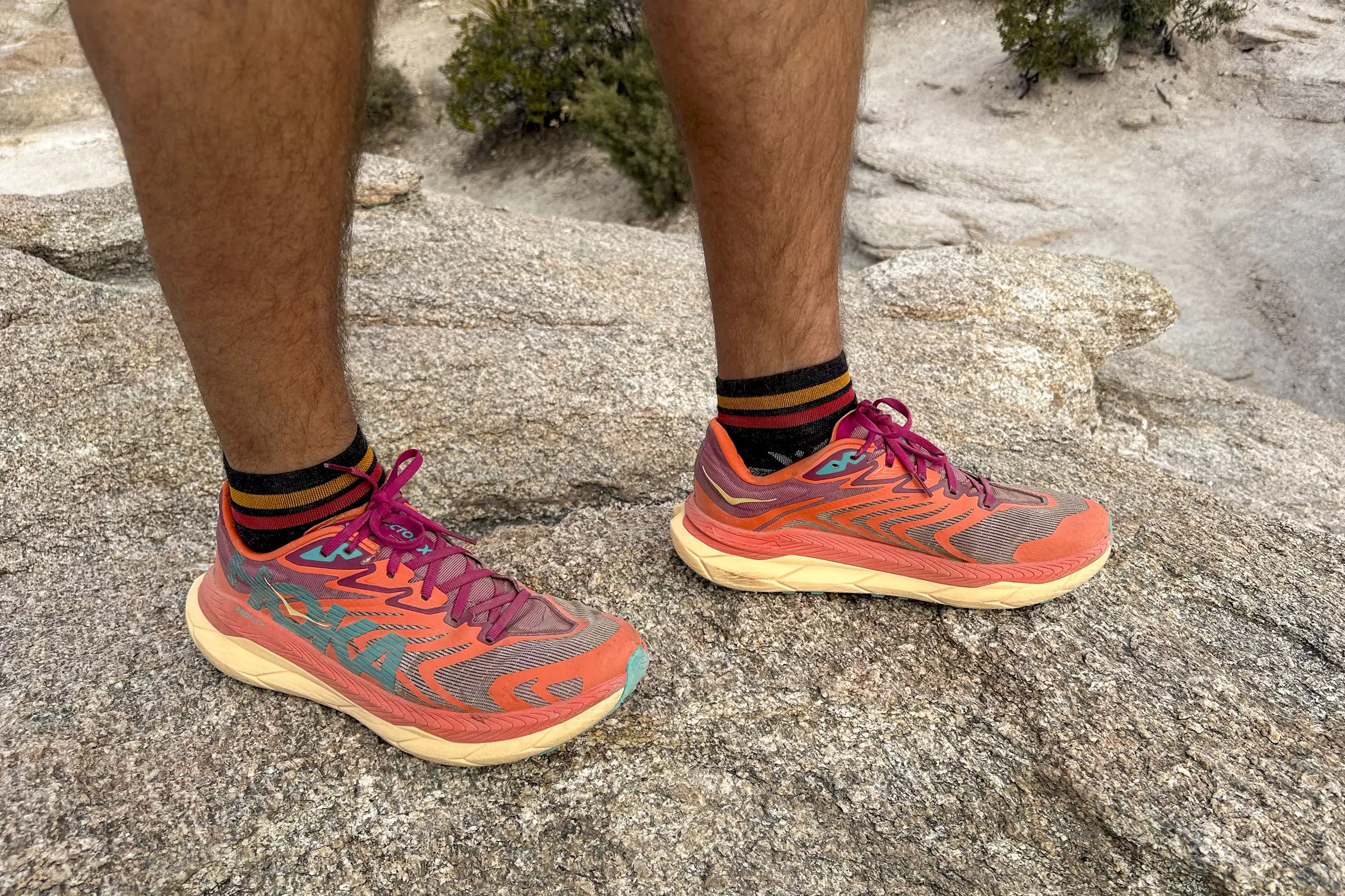 In fact, despite the relatively stiff midsole (thanks to a firm foam and parallel carbon plates), I get a surprising amount of trail feedback in these shoes. That’s something I’ve sought out in other Hoka trail runners.