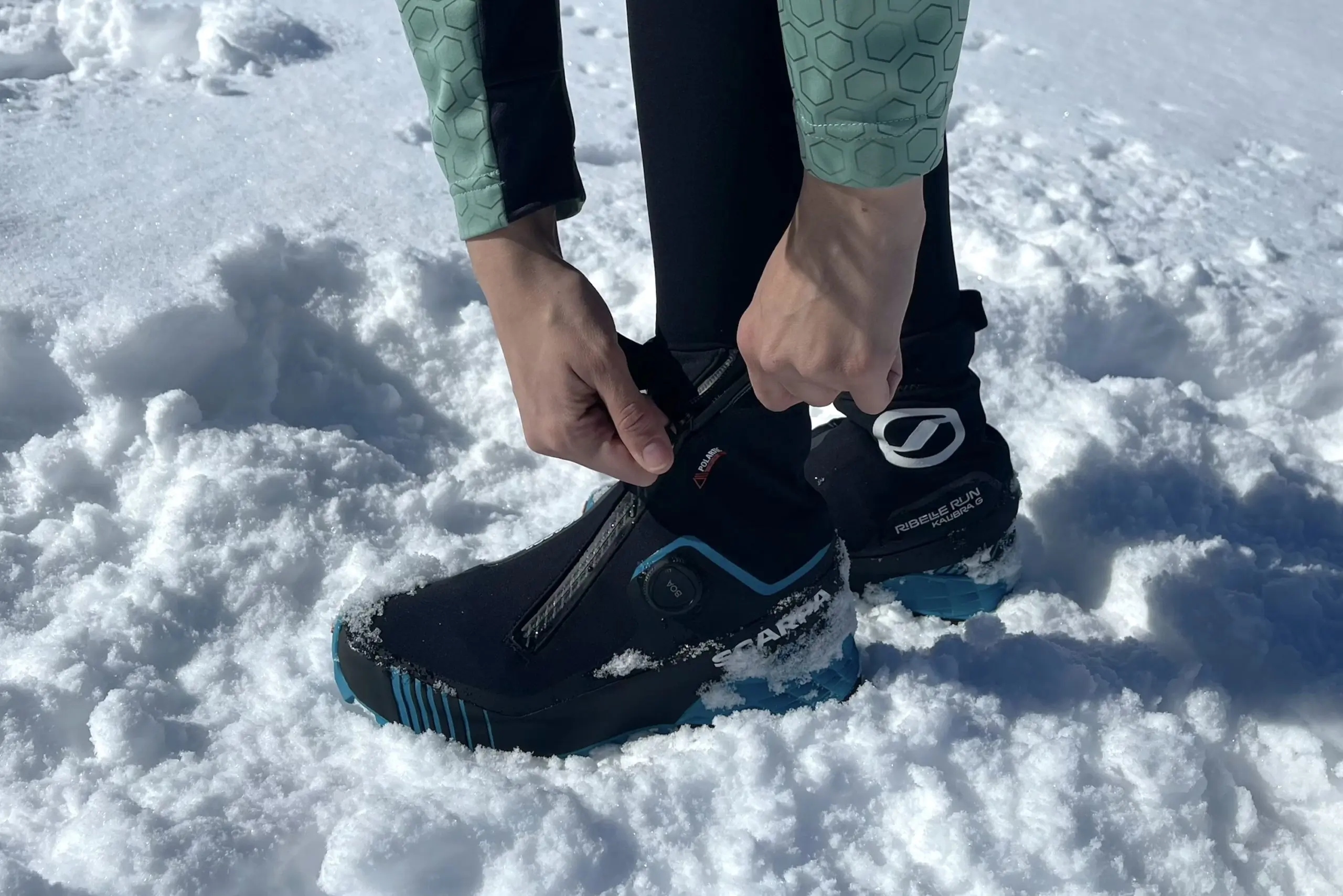 Testers Mary and Bergen both found that the SCARPA Ribelle Run Kalibra G gaiter provided more than enough protection from snow on both snow packed trails to freshly snowed-on trails with 0-6 inches of snow (and while post-holing on several occasions). The BOA Fit System and Dyneema laces, wrap, and tongue is all perfect and moved comfortably.