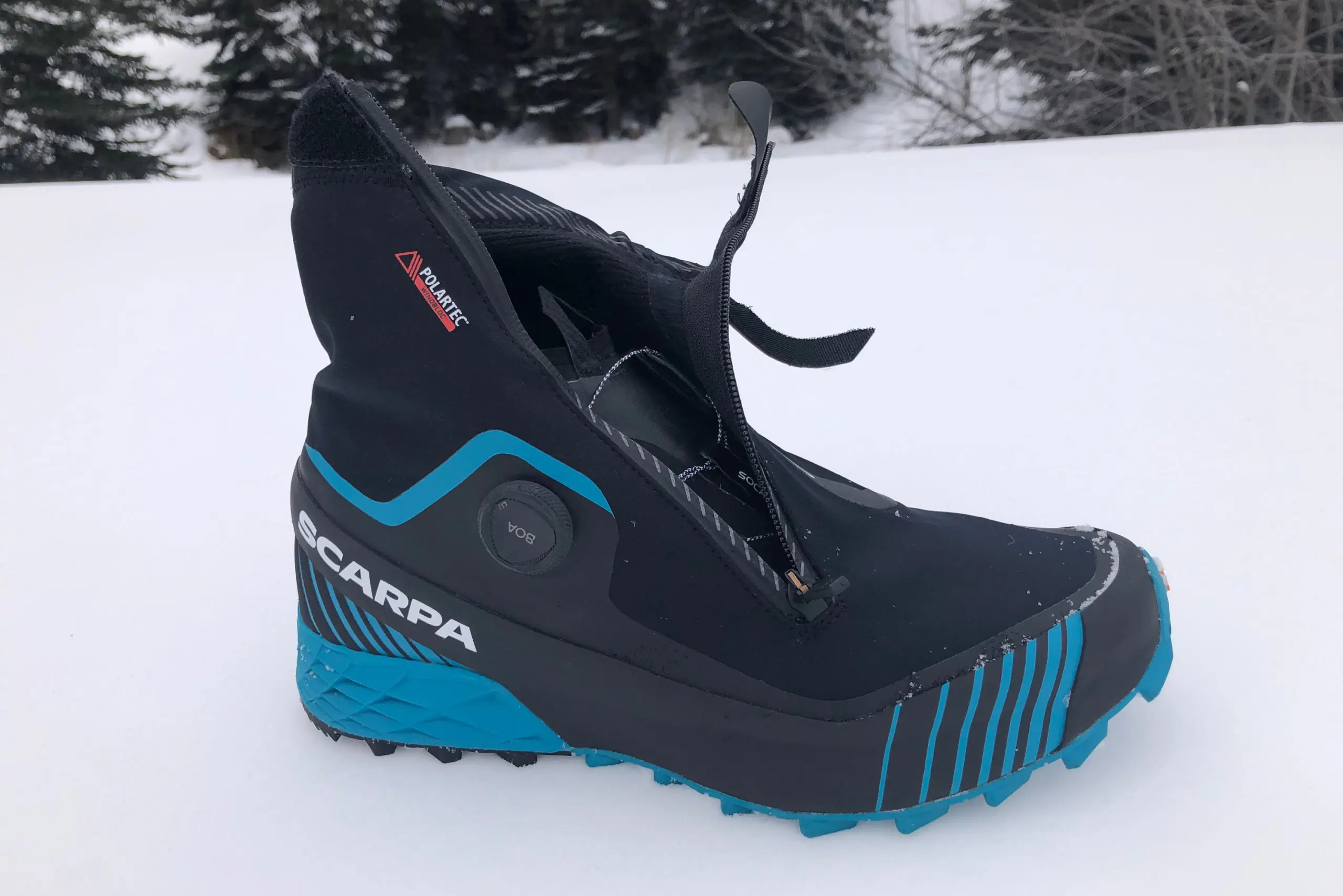In short: The SCARPA Ribelle Run Kalibra G ($240) is an aggressive winter trail shoe designed for runners that refuse to give up trail running during the winter months. The relatively stiff shoes sport a weather-resistant gaiter and a unique BOA Fit System system to keep your feet secure and protected. The gaiter element and zipper design are impressive, even compared to the select few on market with similar BOA dials and gaiter designs.
