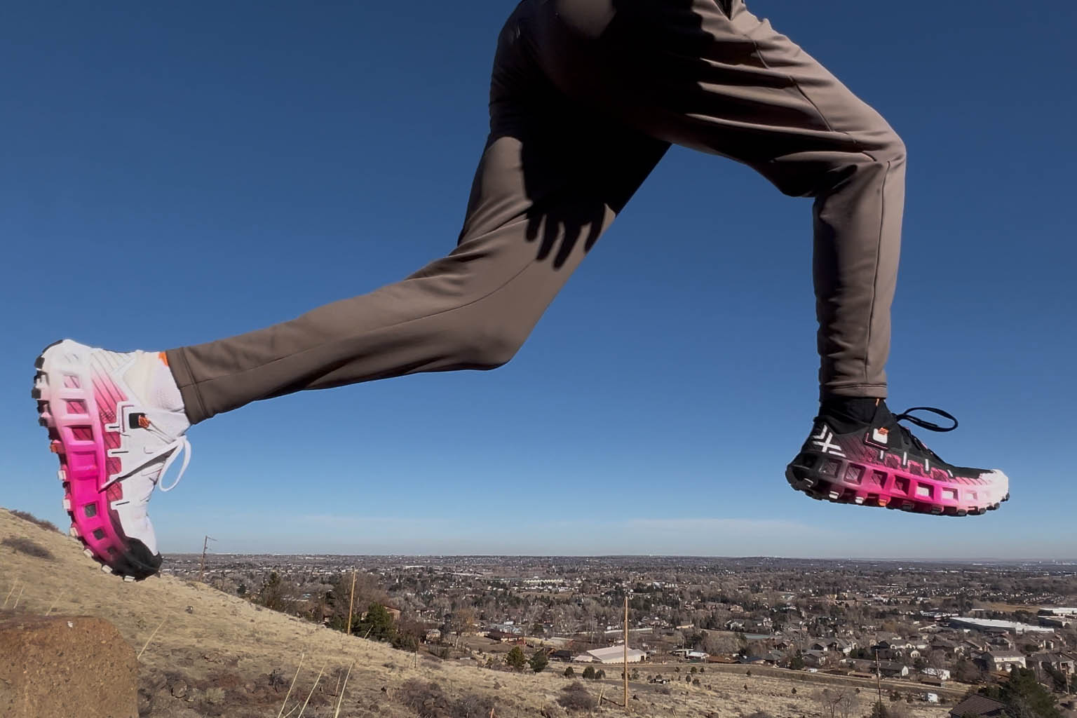 The trail ahead is rocky, steep, and covered with patches of snow and ice. I plunge forward, dropping from the ridge as sunrise crests over the Great Plains below. My feet hop from rock to dirt, and I wear a silly grin as I careen down the rustic trail. Yes, these wild-looking shoes can really grip. This is one fun descent.