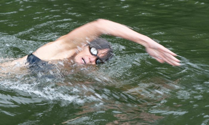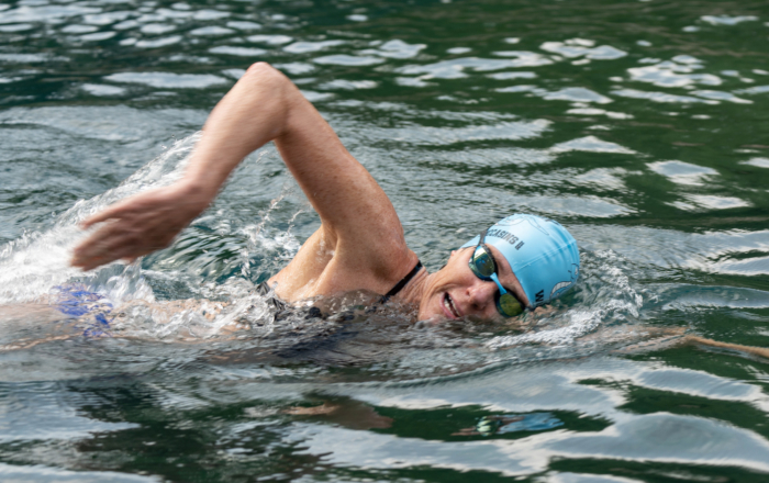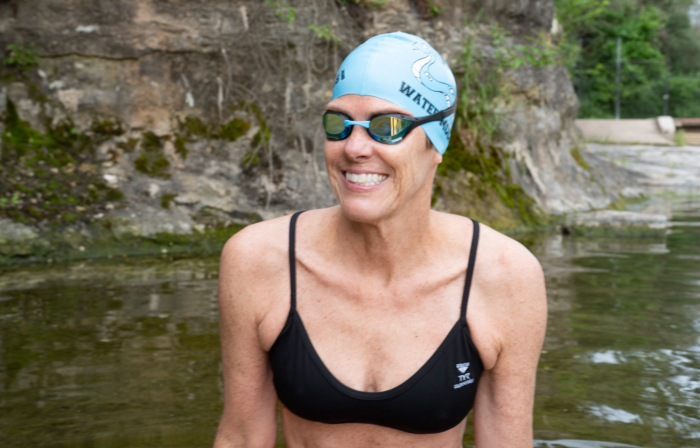 She has competed in sprint and Olympic distance triathlons. In more than 40 years of swimming with organized groups, she’s worked her way through hundreds of pairs of swim goggles.