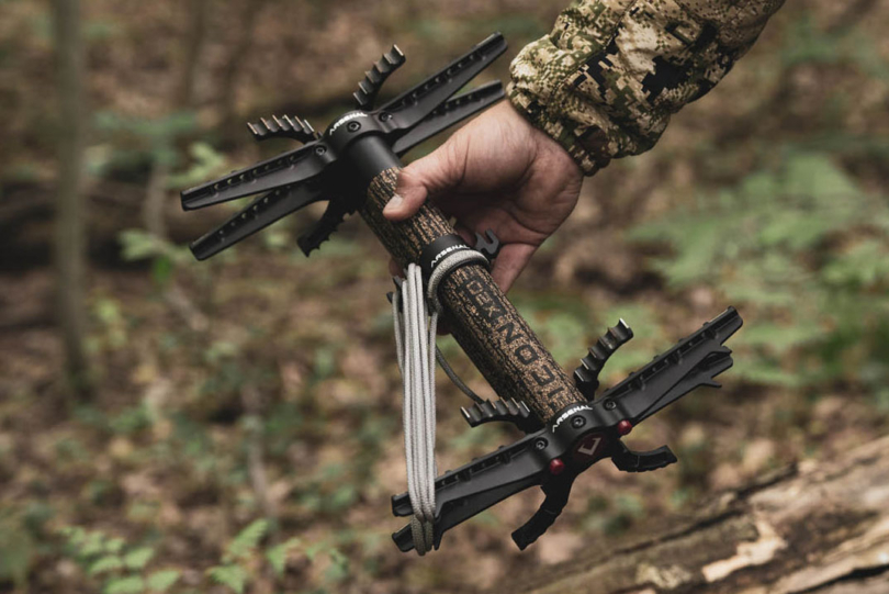 In short: These climbing sticks have a unique telescoping design that allows a pack of three ($400) to collapse into a package that fits into a shoebox. Thanks to the small, interlocking design, they fit securely on my pack, without catching branches and limbs as I move through the woods. When it comes time to get up a tree, they expand for added height and lock on the tree with a simple, secure, minimalist ROPELOCK system. No straps needed. Grippy steps and glow-in-the-dark tabs provide sure footing even when you’re climbing in the dark. Yes, the price is steep, and you may need to add raiders to them to get as high as you’d like, but these are killer sticks for hunters dedicated to mobility.
