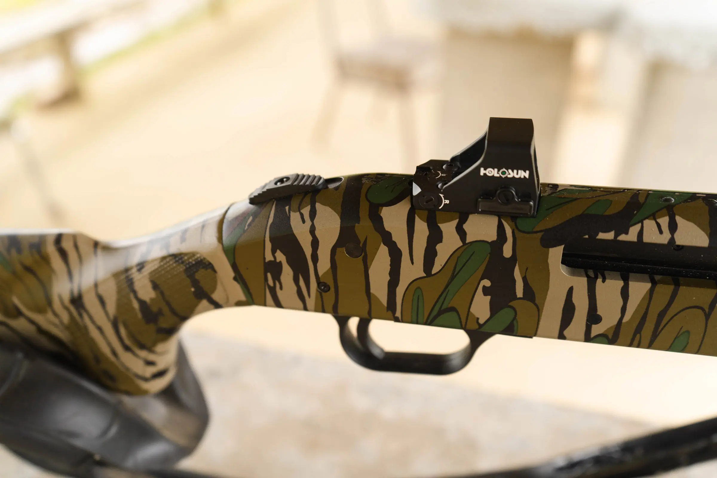 Out of the box, the Mossberg 500 .410 Turkey comes with a front fiber optic sight, a 24-inch barrel, and Mossy Oak’s popular Green Leaf pattern — hallmarks of the turkey-specific shotgun. However, the Optic-Ready version also includes a recessed receiver that allows you to mount a red dot directly on it. Specifically, the .410 Turkey features the Shield RMSc footprint and accommodates the Holosun HS407k (which I used). It also includes a recoil pad (though unnecessary) and a factory XF choke.