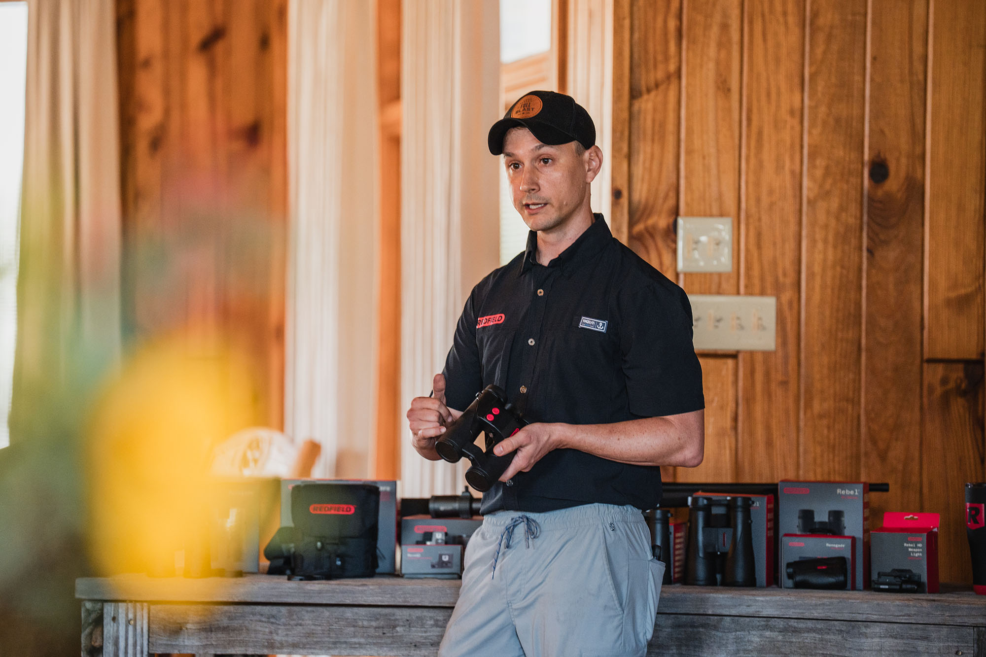We all met at the main lodge to look over the full lineup of gear, not just the shotguns. Redfield brought out a spread that included the new Renegade 10×42 binoculars, which I now have a pair of and genuinely do like, along with the Rebel RFB 8×42 rangefinding binoculars.