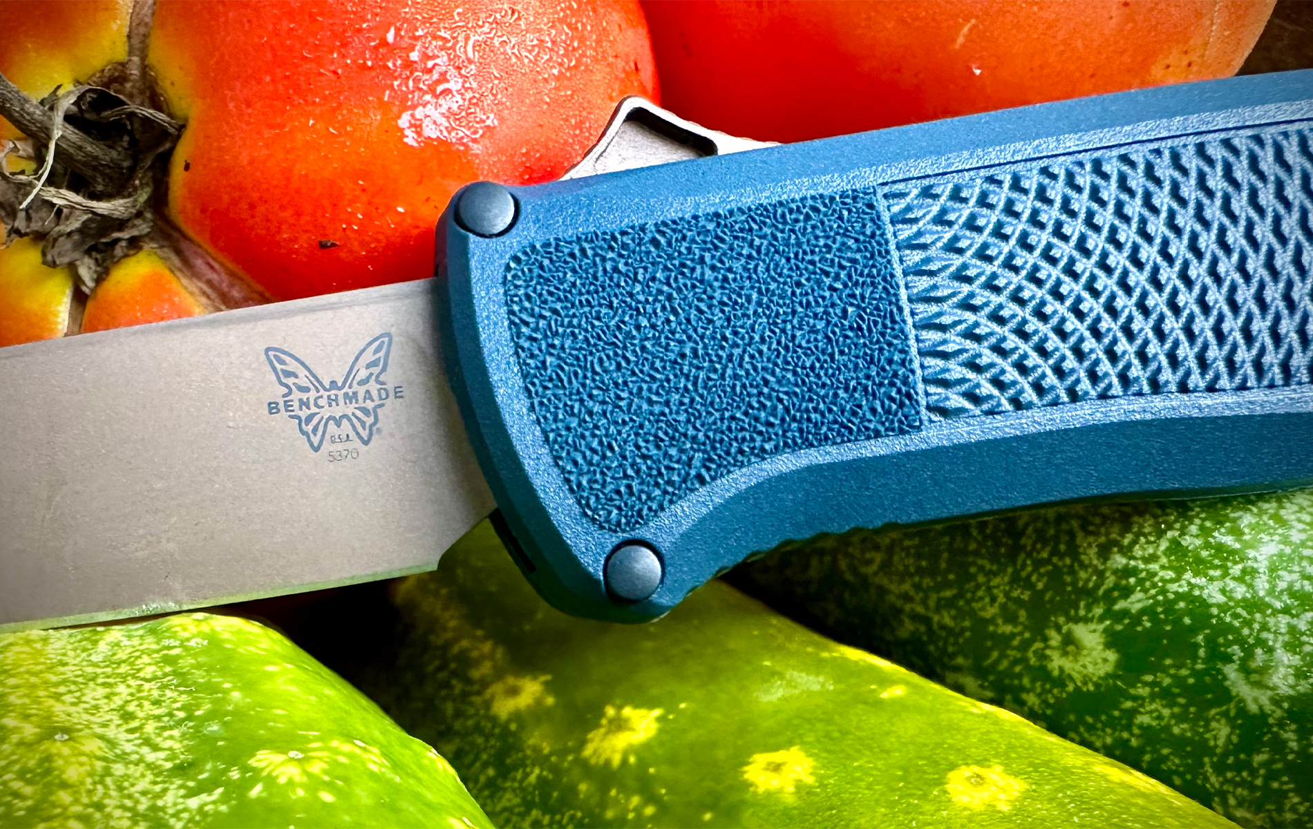 Benchmade has gone some great directions with its color combinations and the juxtaposition of the Crater Blue Grivory and bronze PVD coating of the blade, spine fire button, and butt cap looks very sharp.