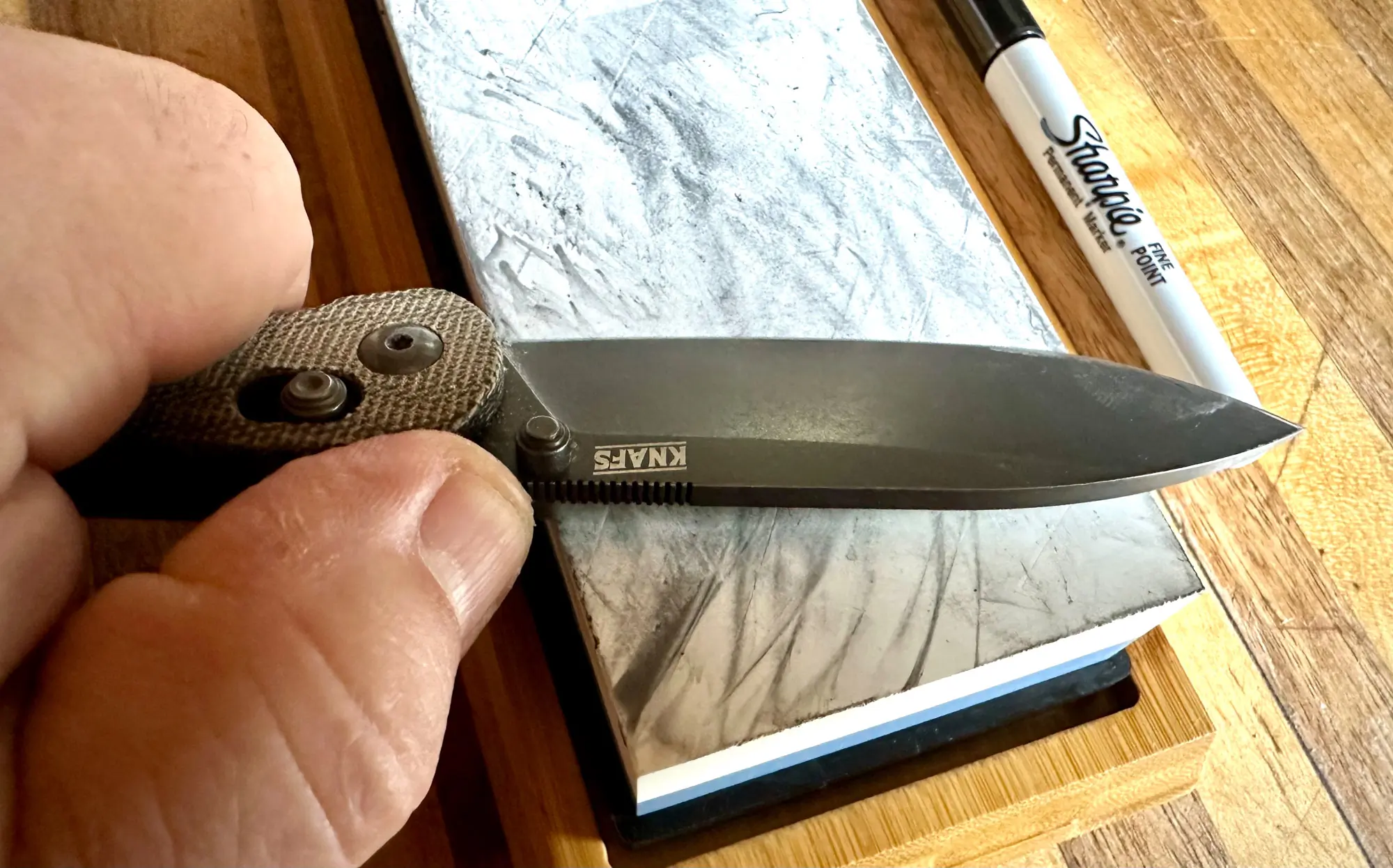 The more material you need to remove, the coarser you should start. For simple sharpening, coloring in the edge of a blade with a black marker makes it easy to ensure you’re matching the existing edge angle.