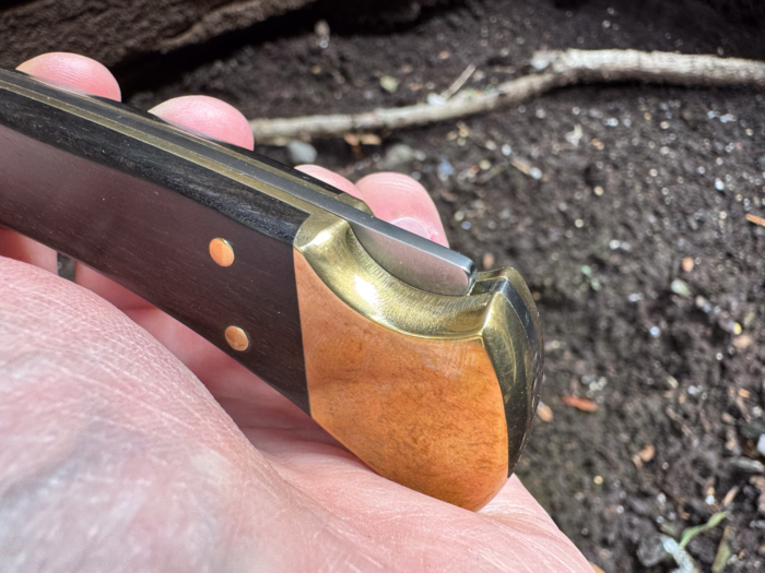 Ebony wood scales join the polished brass bolsters, held together by six visible brass pins and a pair of visible stainless steel pins for the pivot pin. For $10 more, you can buy a version with finger grooves carved into the handle, but I like the smooth original grip.