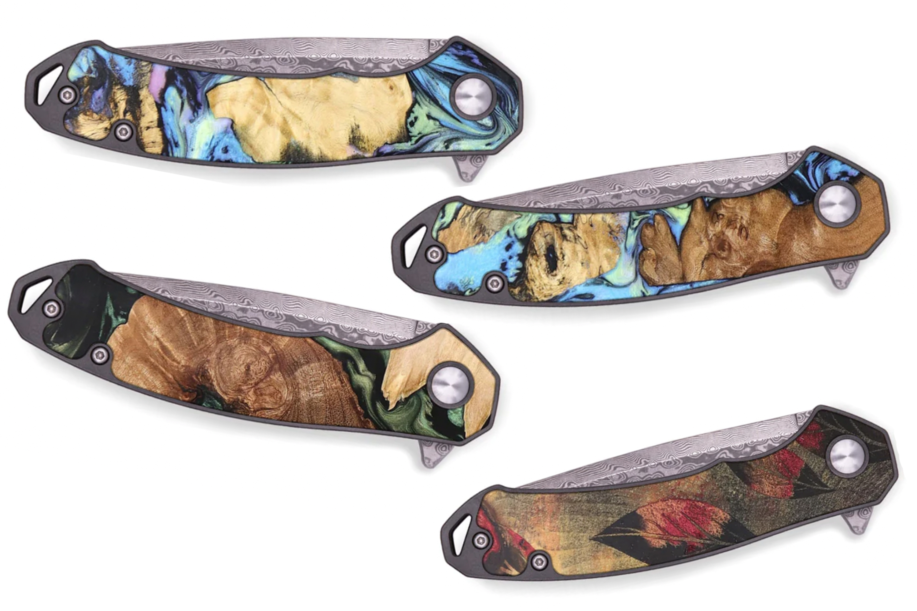 - Materials: Titanium handle, titanium clip, burl wood, resin