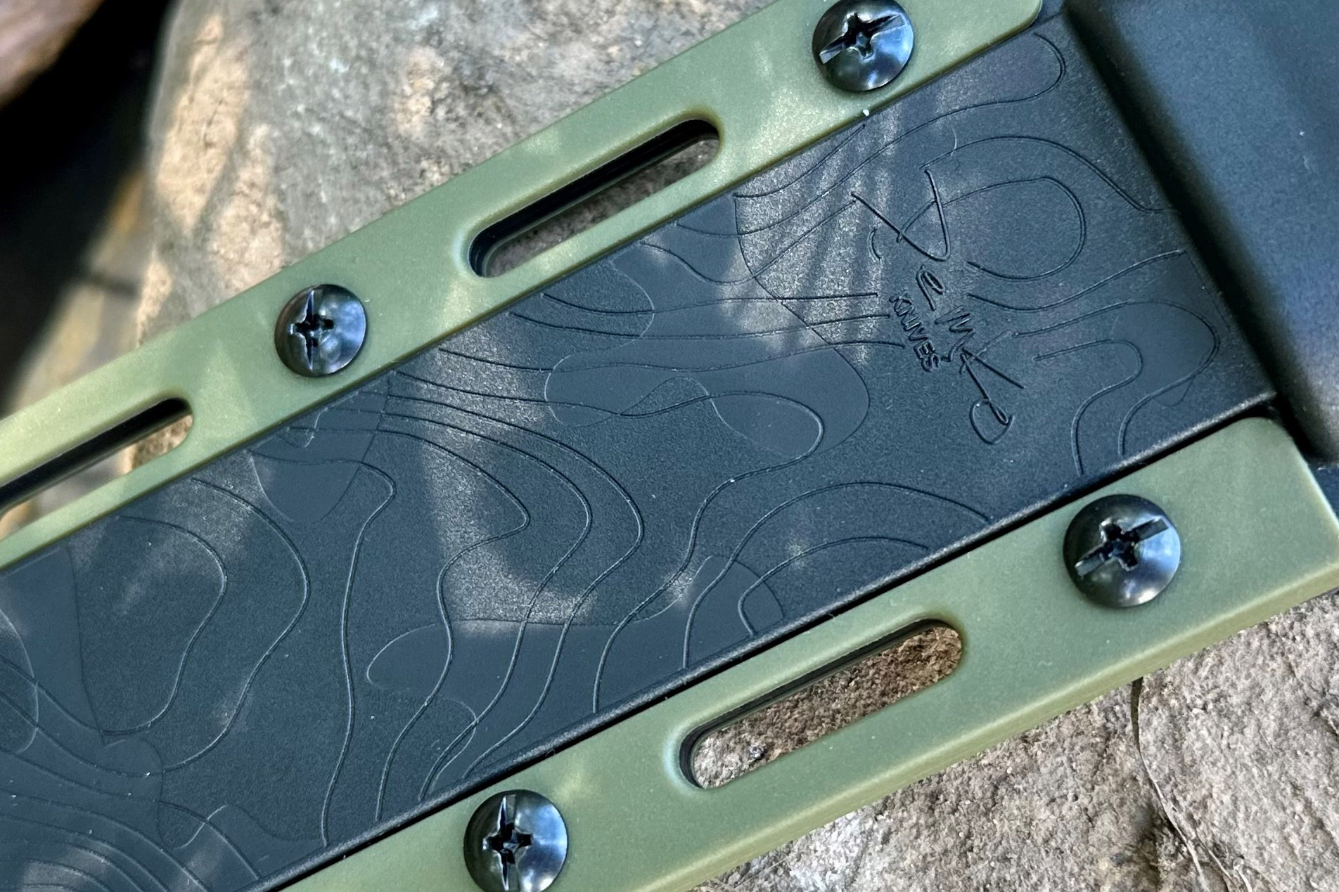 The sheath for the FreeReign is a real trip, too. In place of the common Kydex sheath stands a stylized, injection-molded sheath, black with green accents that match the color of the knife handle. Engraved into the sheath itself is a topo design with the Demko name.
