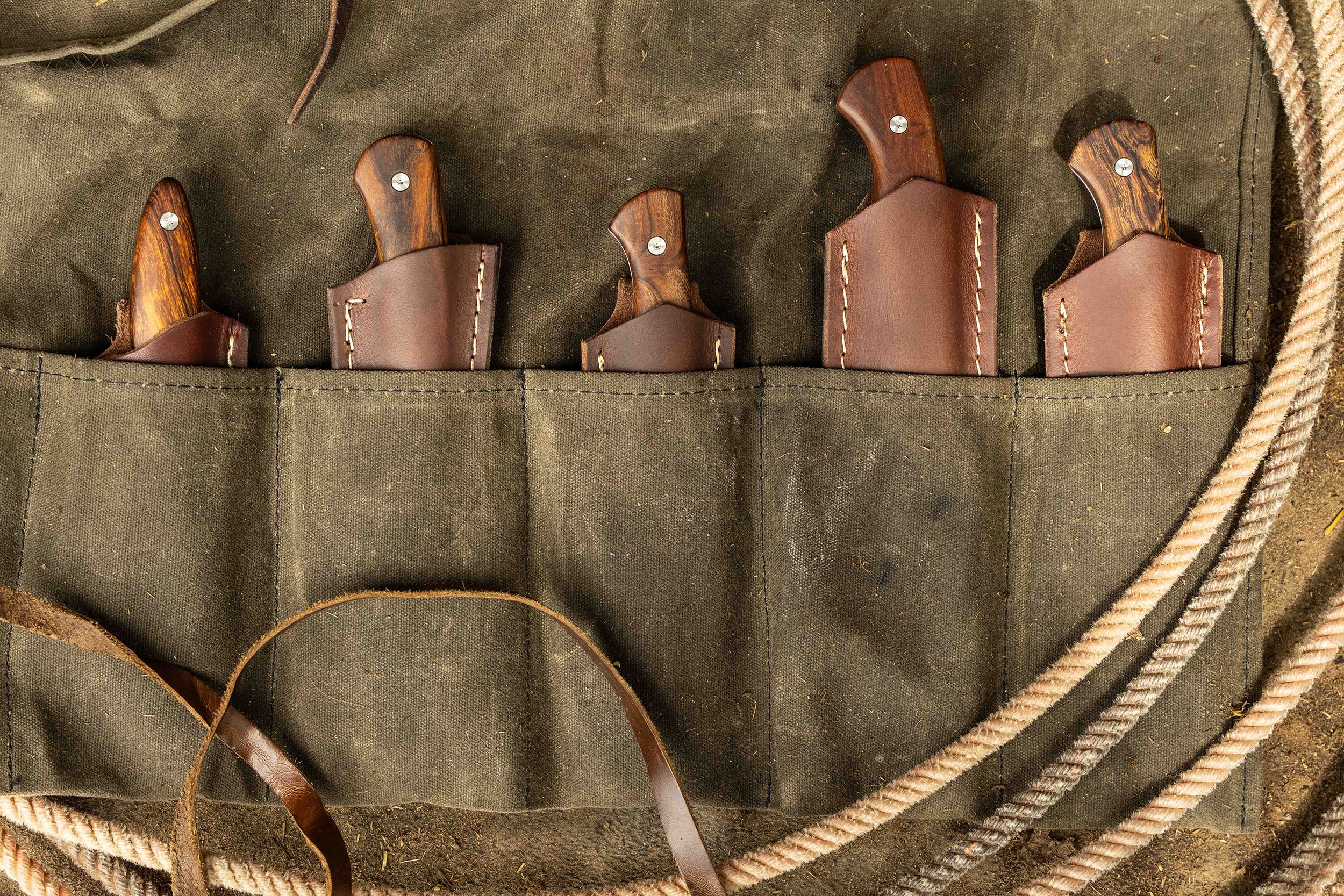 Complementing the handles are custom leather sheaths, handcrafted by Francesca at Teton Leather, adding a touch of artisanal excellence to each piece.