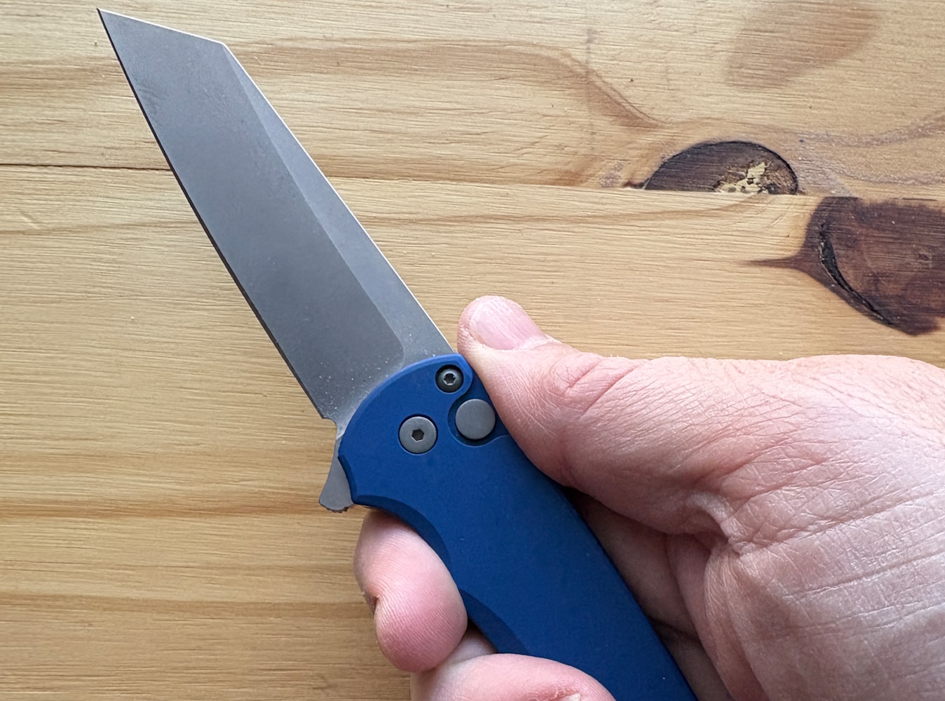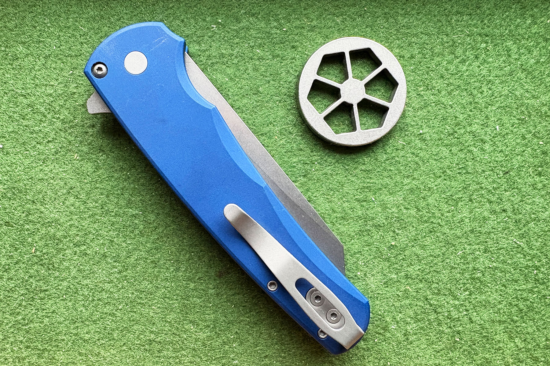 The aluminum, with its blasted finish, carried well, and the clip, a simple deep-carry design, also worked well. The knife feels light for its size, and the choice of aluminum over titanium was, in my opinion, the right one.