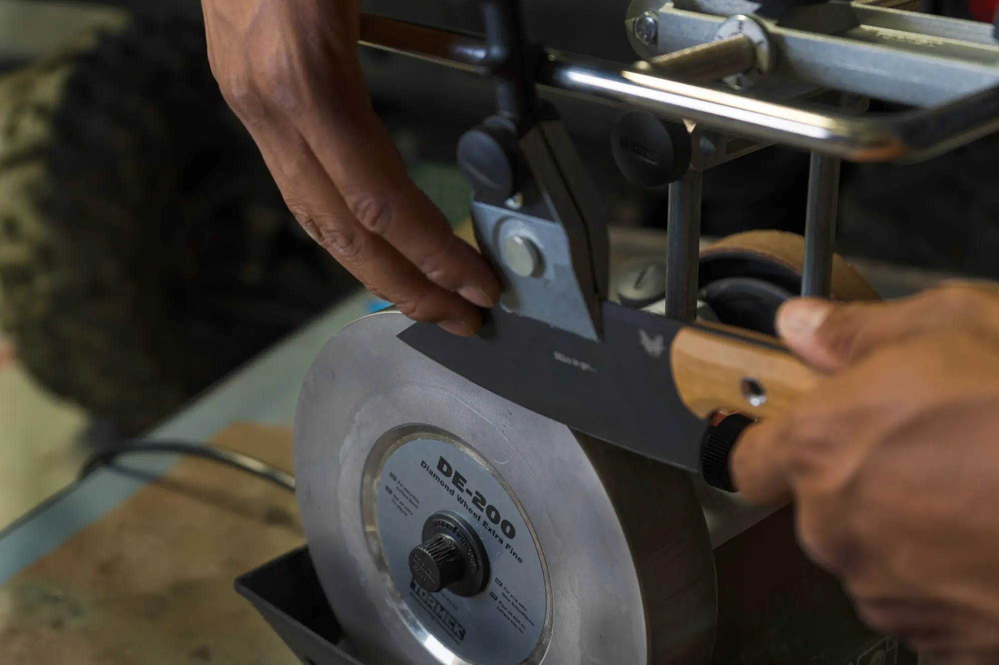 Throw in an MB-102 Multi Base, and you’ll also be able to grind on the side of the diamond wheel. For edges with a high grind, such as chisels, single-bevel, and asymmetrically ground Japanese cutlery, this is a boon. It provides a wider contact area and ensures a perfectly flat edge. Add the Tool Rest, and freehanding tools like double-bit axes or convex edges in general becomes easier too.
