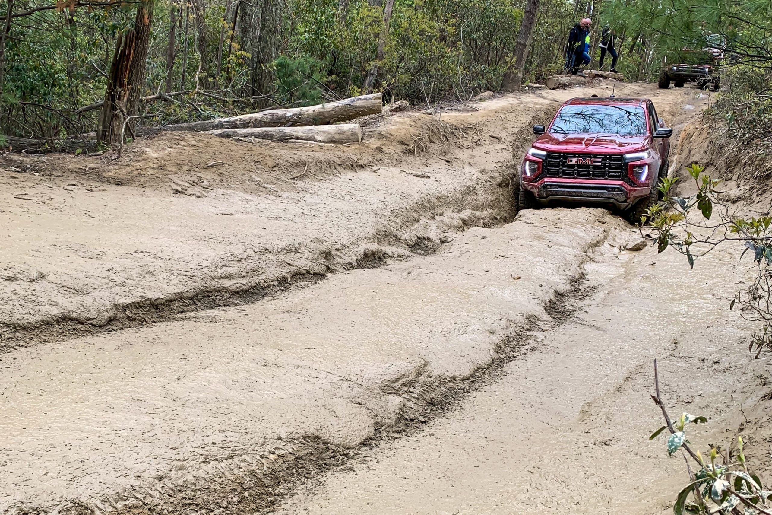 Then we hit the “mud pit.” A chunk of trail where the devil scratched a four-foot-deep trench and then filled it sharp rocks, discarded limbs, and 2 feet of mud soup. Ready to throw the truck in reverse and head back, GMC engineers got on the radio and said, “Engage the front and rear lockers and keep your foot on the throttle.”