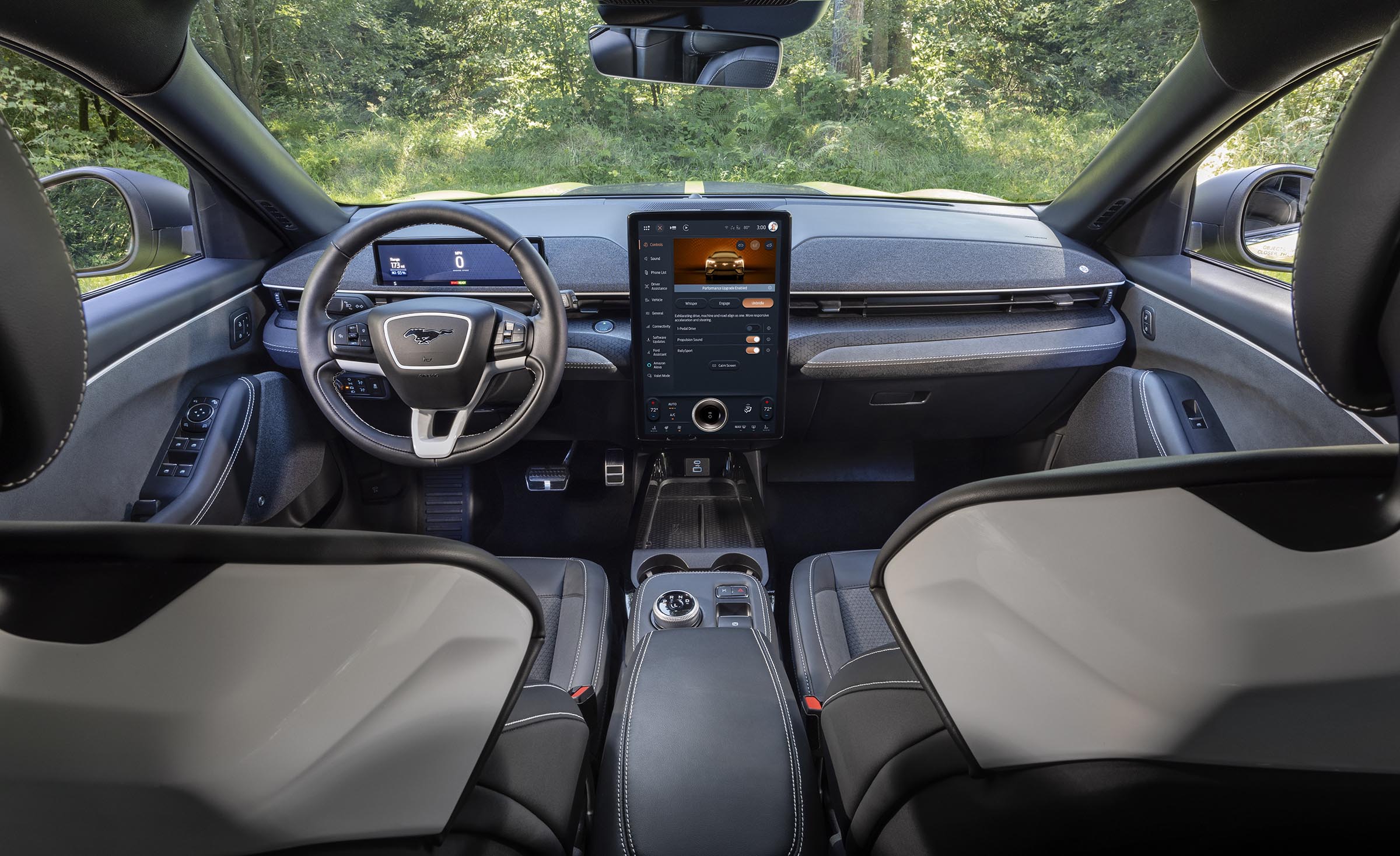 The Rally is largely a Mustang Mach-E GT despite all the mechanical changes. And that’s obvious when you’re just sitting inside. It has the same twin digital display layout, including the positively huge, portrait-oriented infotainment touchscreen. Frankly, I’d have appreciated more unique-to-Rally features, such as displays showing Baja-style performance data.