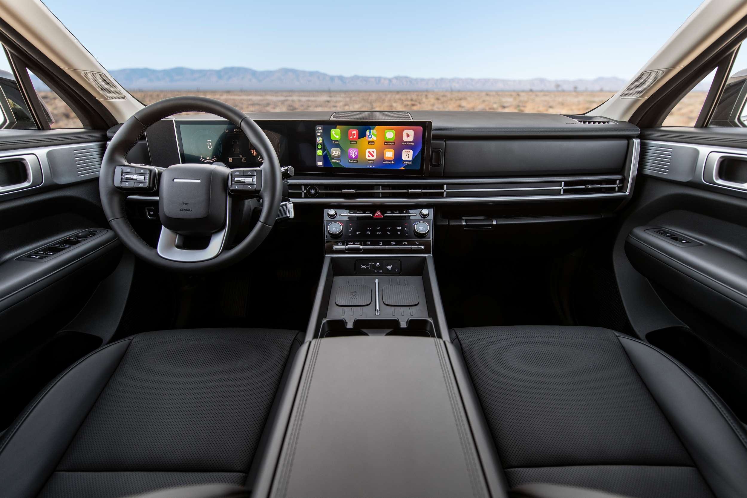 On the inside, the Santa Fe gets a new panoramic curved display. It pairs a 12.3-inch digital dash screen and the same-size center infotainment screen into one bezel for a cleaner look. Over-the-air updates will be offered for the systems.