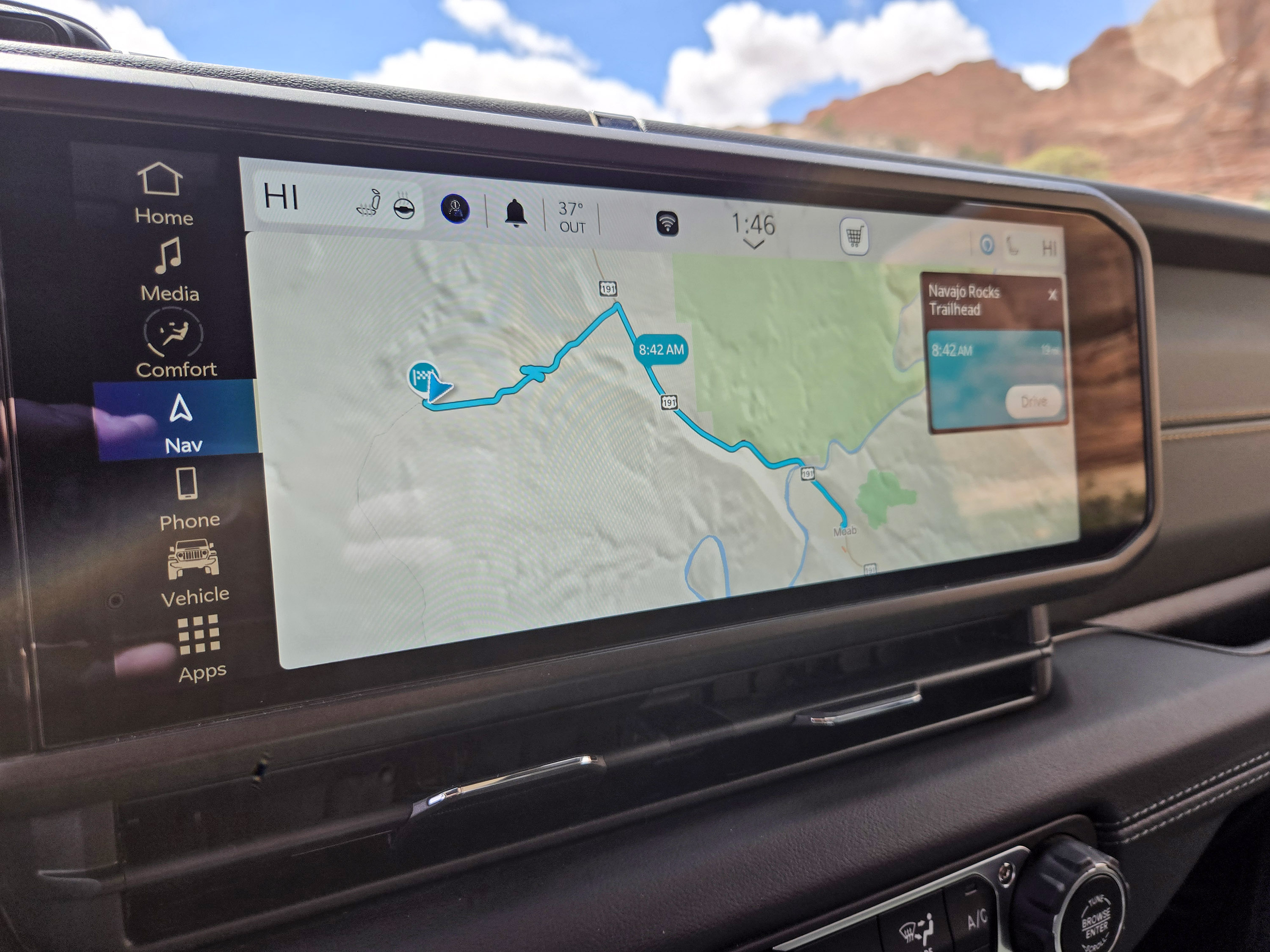 There are a wide array of menus, all relatively intuitive and easily navigable with good UX. Jeep Adventure Guides featuring Trails Offroad are also new, and deliver maps of trails all over the USA. A full subscription unlocks more than 3,000 Trails Offroad guides and maps, which I and other journalists used while on Moab’s 7 Mile Rim trail.