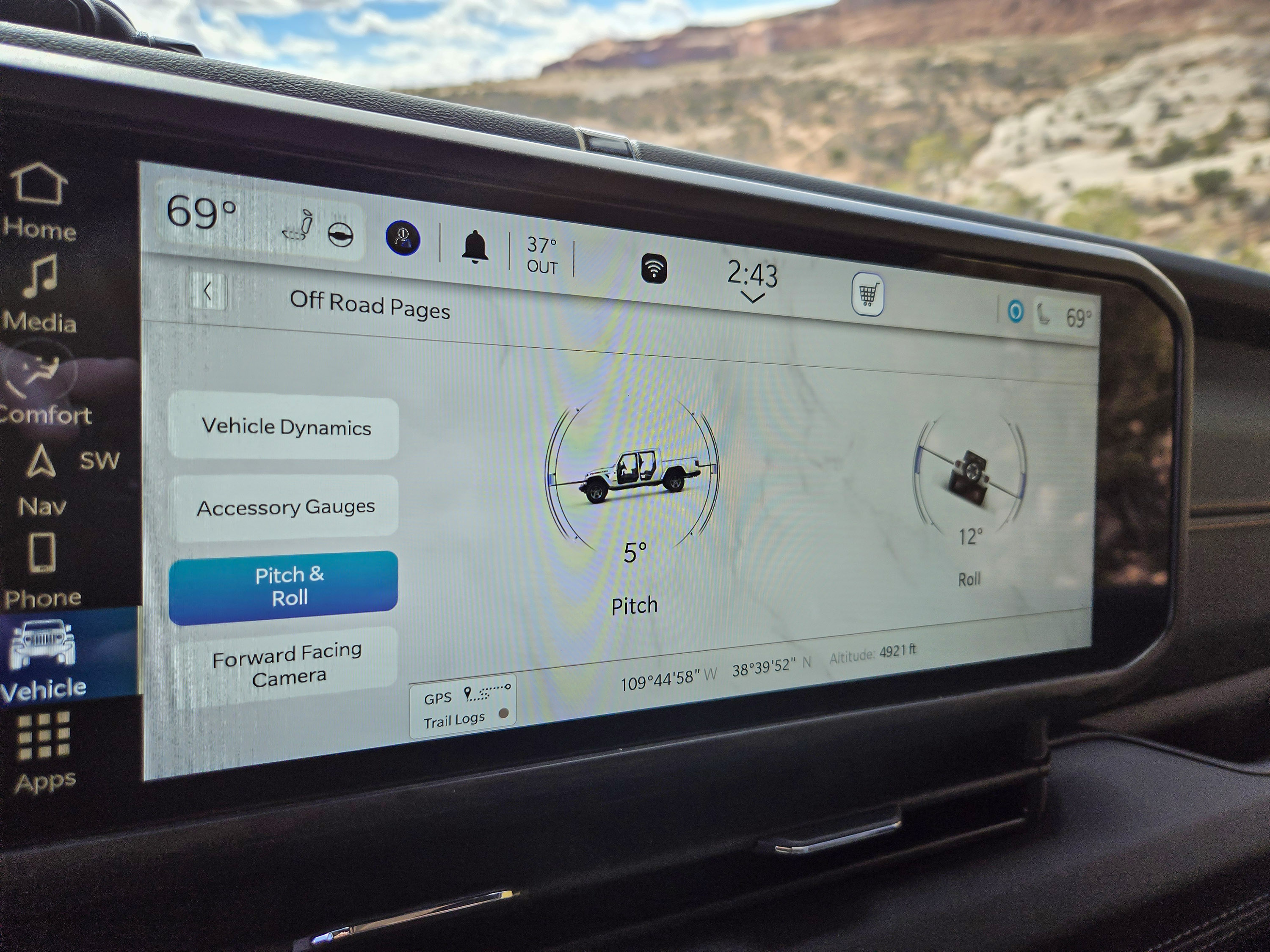 Before I took my Gladiator Mojave over Rainbow Hill, an off-camber section of slick rock, I switched the infotainment to Off Road Pages, and selected Pitch and Roll, showing me just how much I was leaning. Off Road Pages also has Vehicle Dynamics showing driveline’s status.