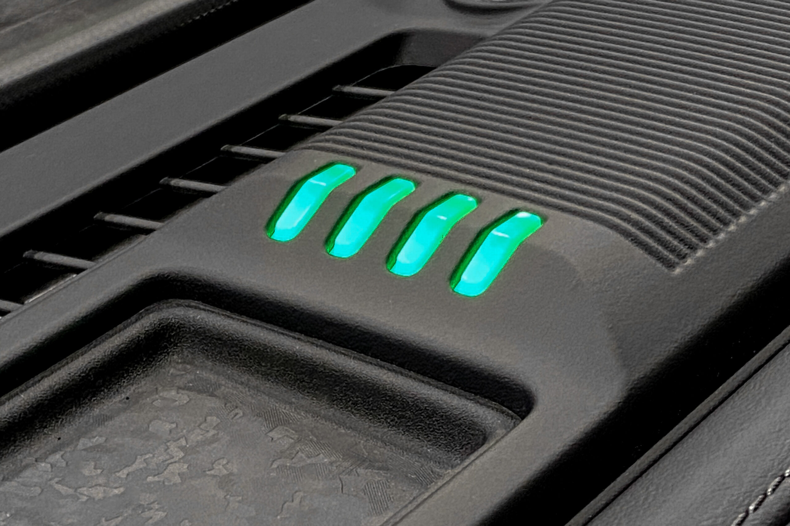 The last thing you might notice inside a 2024 Wrangler 4xe is a new set of lights on the top of the dash. This is a new battery charge indicator system. A handy quick visual, especially when off-road driving in full electric mode.
