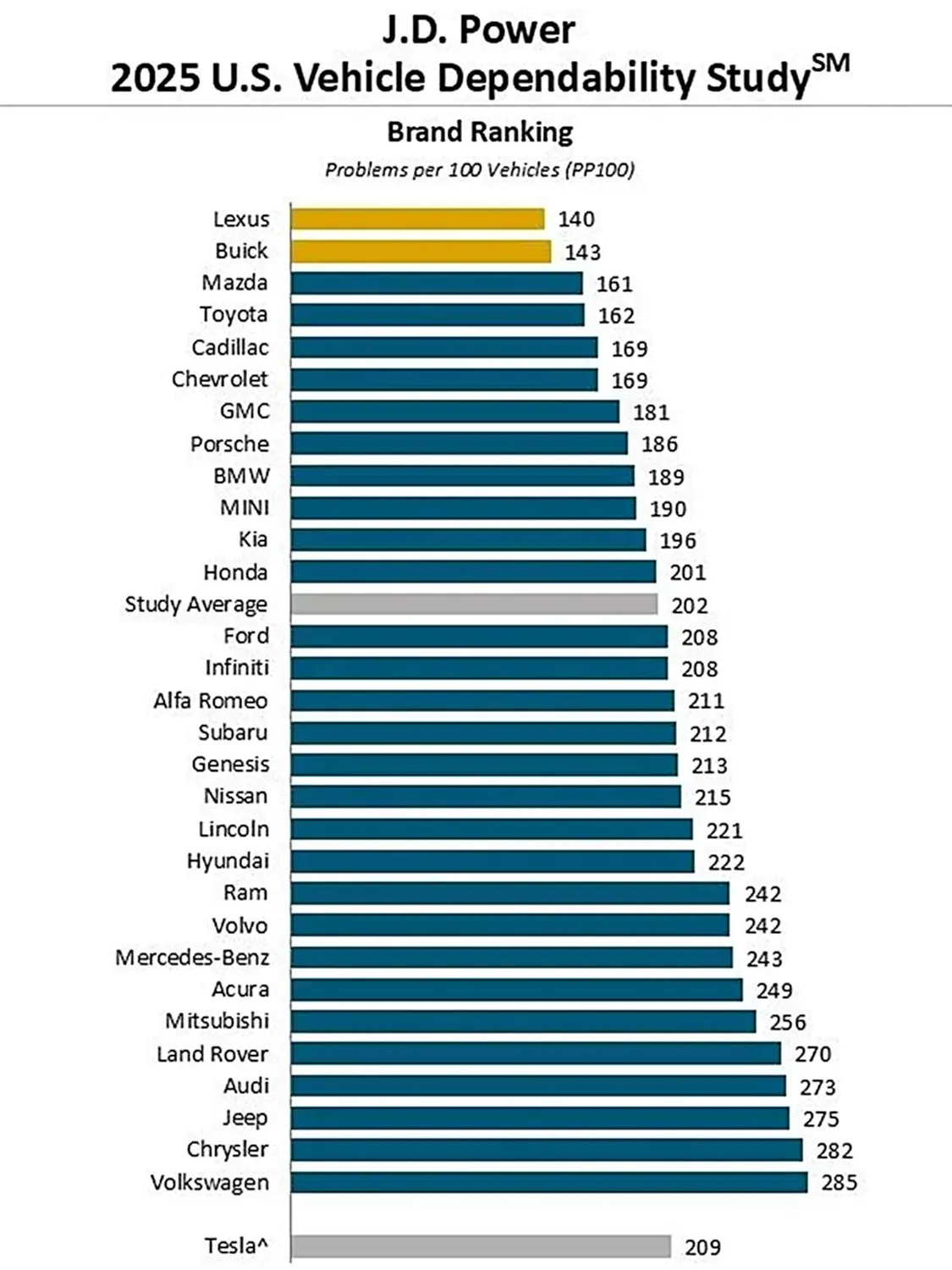 The study covered 30 brands. Tesla was not included because it does not allow access to owner names in a number of states. Based on the surveys submitted by owners elsewhere, Tesla came in with a below-average score of 209 problems per 100.