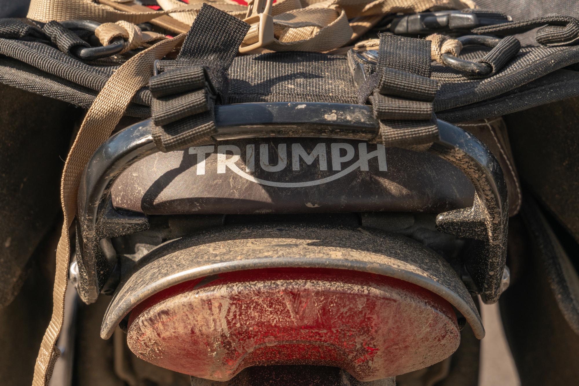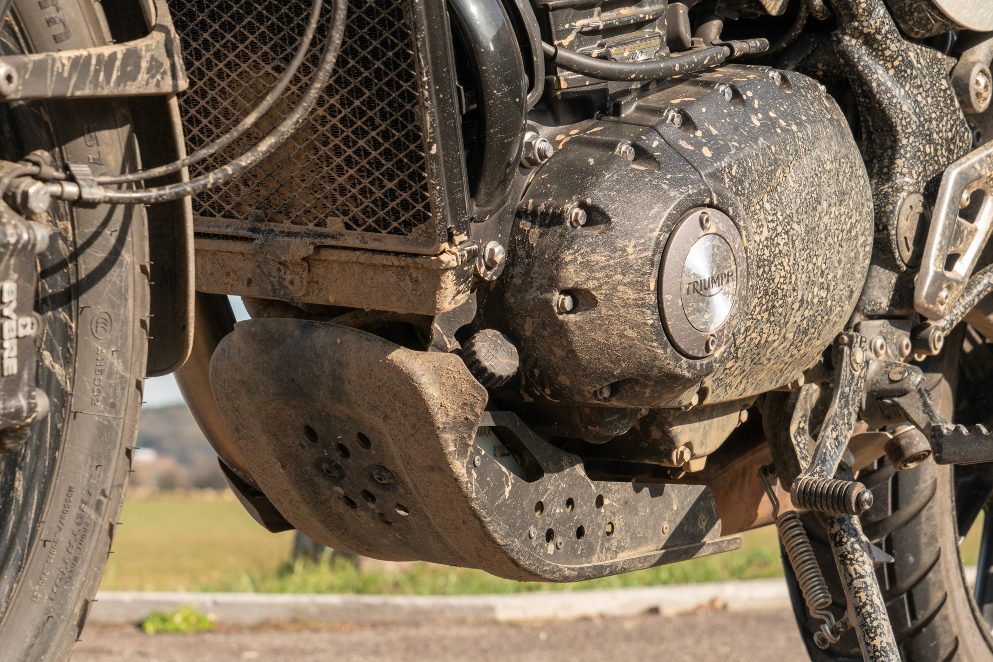 My other notable complaint was a lack of any real protection behind the front wheel. The radiator hangs down into harm’s way, and the coolant reservoir sits just underneath it. This meant all that stood between me and a potentially catastrophic event out on the trail was a thin plastic skid plate. Upgrading to aluminum protection on both counts would be money well spent. And as luck would have it, Triumph offers a proper skid plate as a factory accessory.