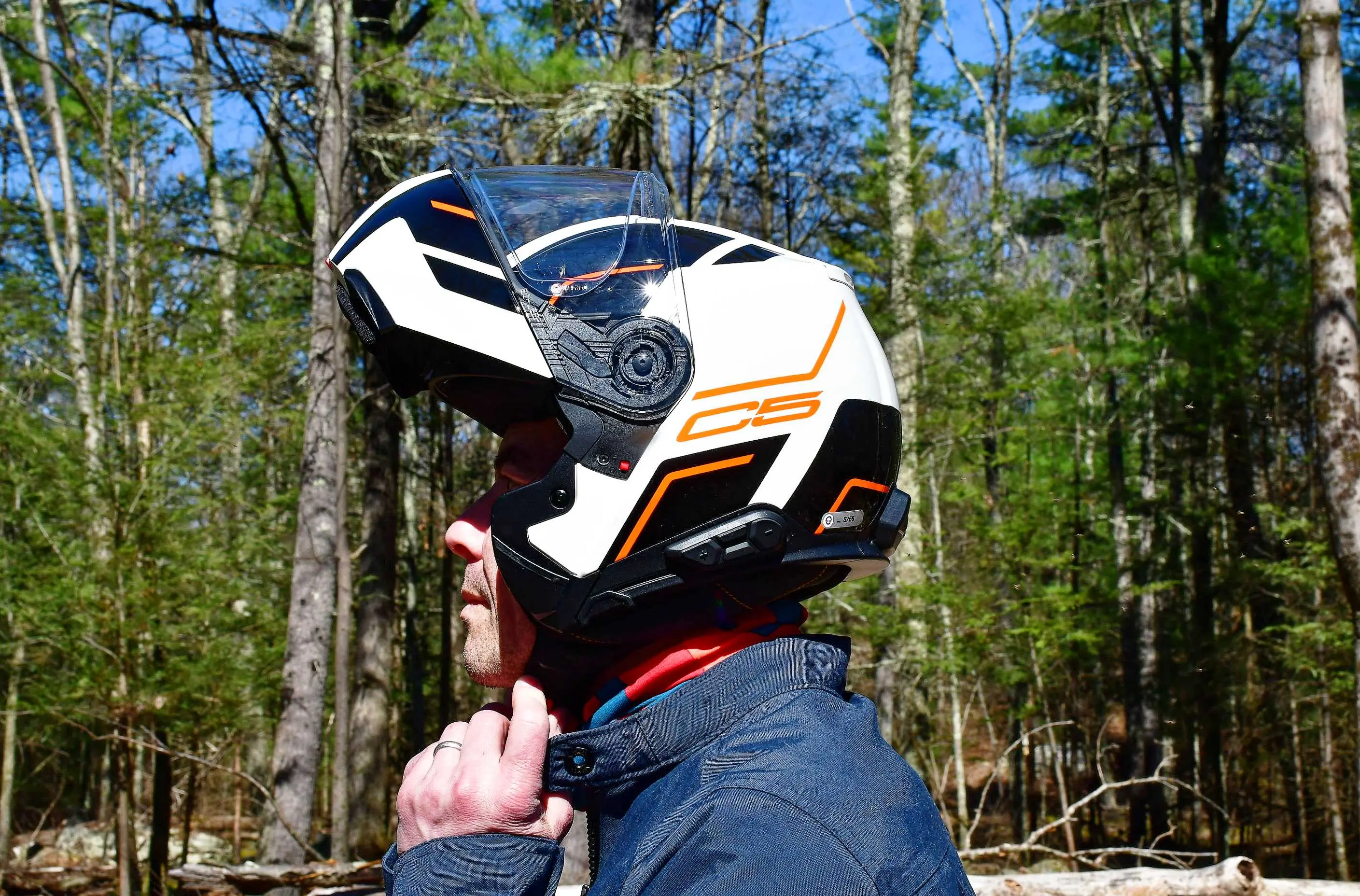 Modular motorcycle helmets include a hinge chin bar, like on the Schuberth C5 and Shoei Neotec 3. That means you can swing that chin piece up and out of the way. The design is handy for taking a swig of water while you’re gassing up or chatting with a buddy about the next section of road.
